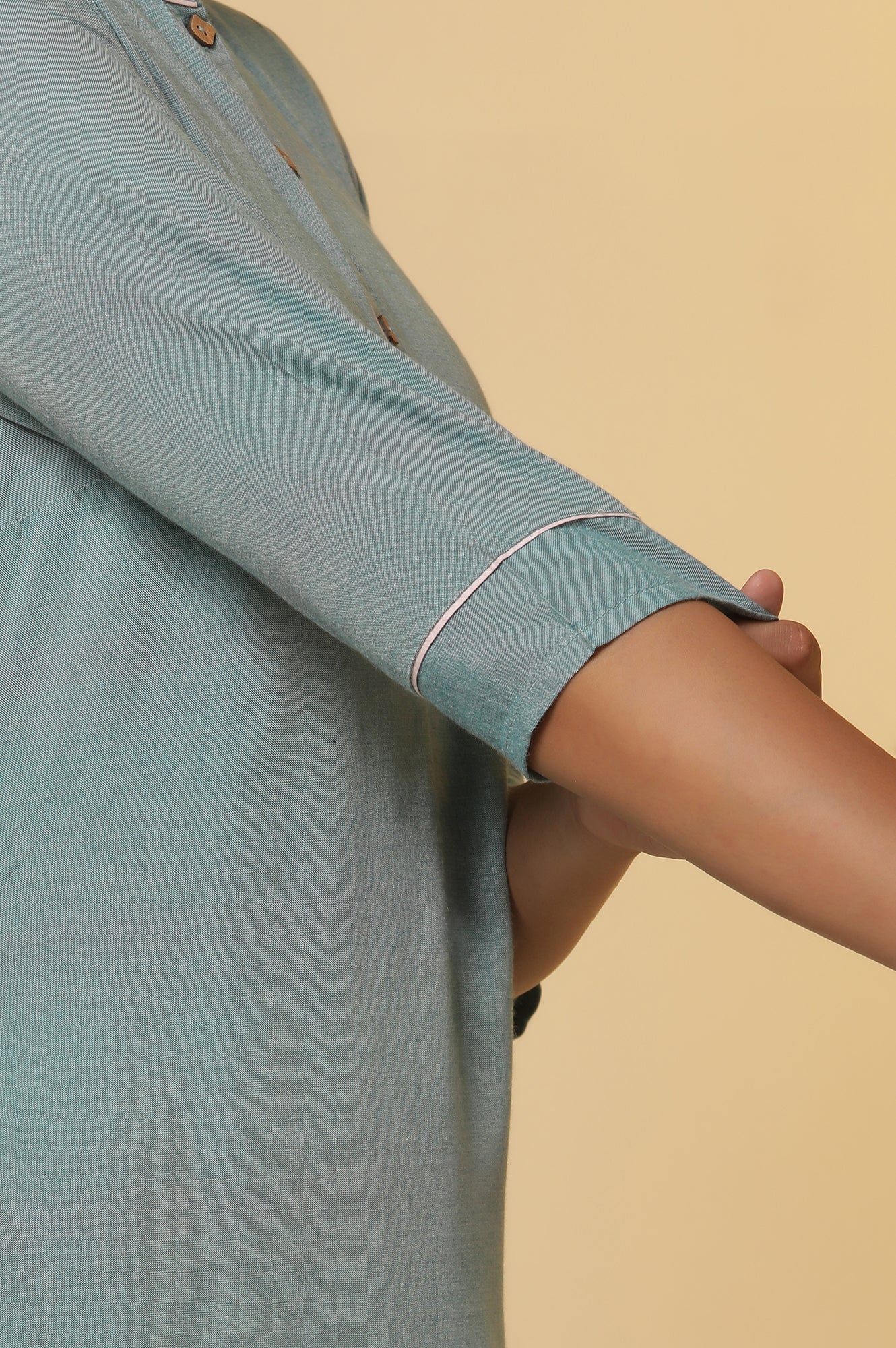 Amp up your casual look with this stylish blue thread embroidered straight kurta set. The kurta has mandarin collar with half button placket and it is paired with pink flared palazzo pants.