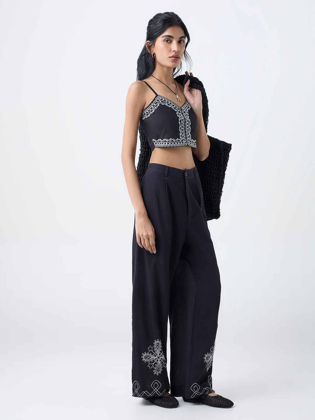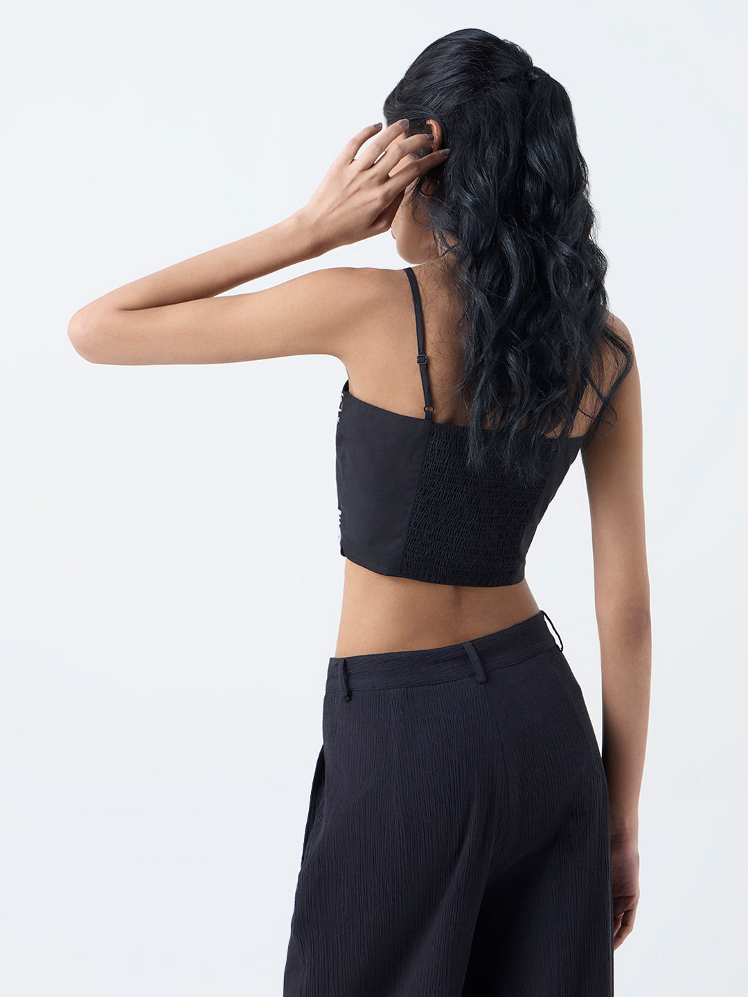 Infused with bohemian charm, this black crop top from Bombay Paisley is adorned with fine embroidered detailing that lends artisanal richness to its pure cotton profile. The V-neckline and slender spaghetti straps create an effortlessly feminine shape, while the smocked back ensures a comfortable, flattering fit.