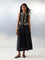 Bombay Paisley brings this black top woven from a cotton-blend fabric, promising day-long comfort. The front design features striking floral embroidery and tie-up details. Framed with a round neck and a sleeveless cut, it adds a refined edge to casual festive dressing.