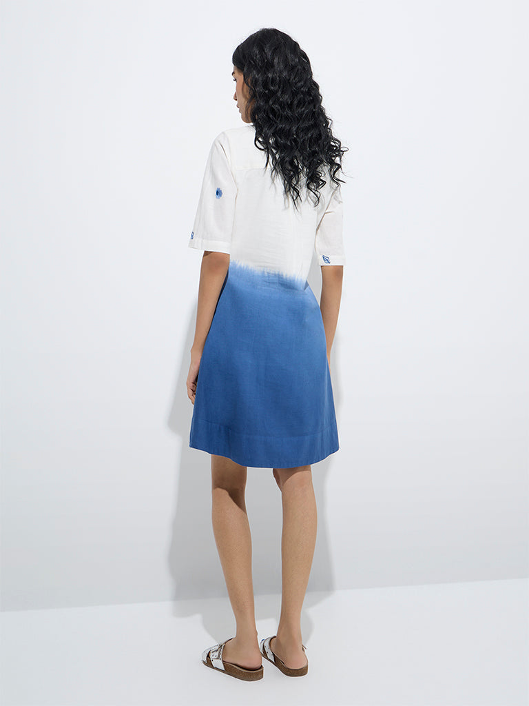 Bombay Paisley launches this blue dress highlighting embroidered motifs on a colour blocked base. Made from a luxurious mixture of cotton-linen blend fabric, it is framed in an A-line silhouette, straight-point collar with beaded details and short sleeves. Completed with functional side pockets, it offers a chic and practical option for casual outings or relaxed gatherings.