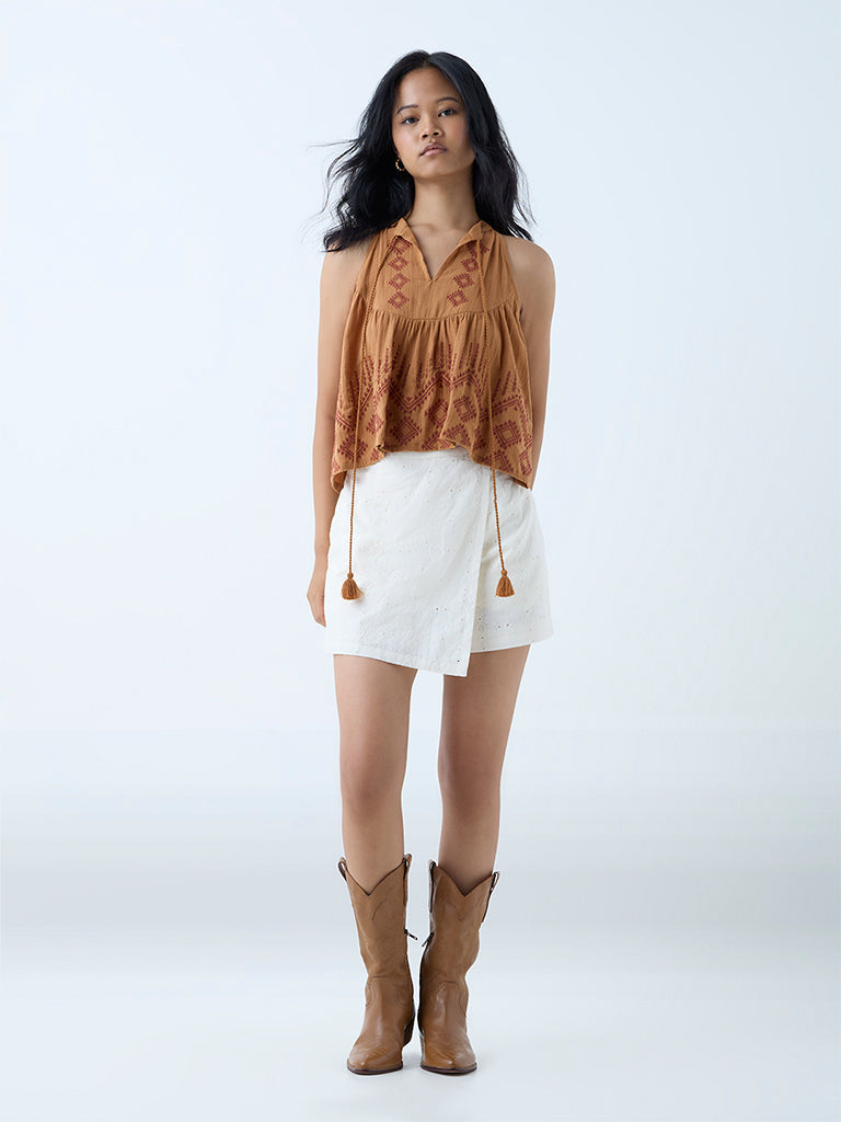 This mustard top from Bombay Paisley is a sunlit staple with embroidered work lending subtle texture. Milled from pure cotton, the sleeveless silhouette is framed by a flattering keyhole neck with adjustable drawstrings for added style.