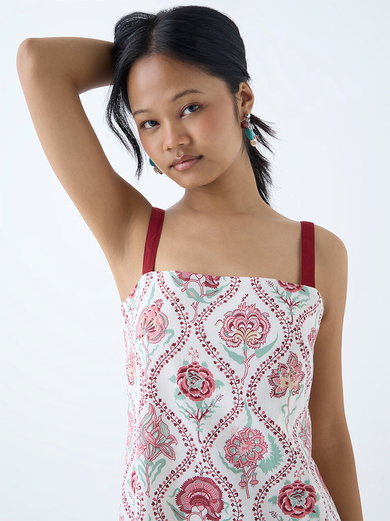 This red shift dress from Bombay Paisley is defined by its vibrant mix of botanical prints that add a touch of whimsy to its clean silhouette. Detailed with a square neck and adjustable shoulder straps, this one-piece will effortlessly amp up your indo-western look.