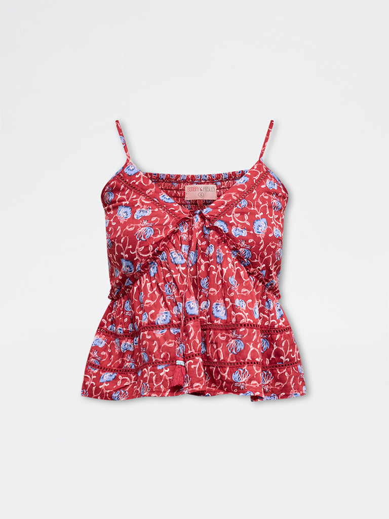 Bombay Paisley brings a playful twist to everyday styling with this red top. Featuring all-over floral prints, it is styled with a V-neck with tassel drawstrings, adjustable straps, a flexible smocked back and finished with a flared hem. Crafted from breathable cotton fabric, it keeps the look light and comfortable.