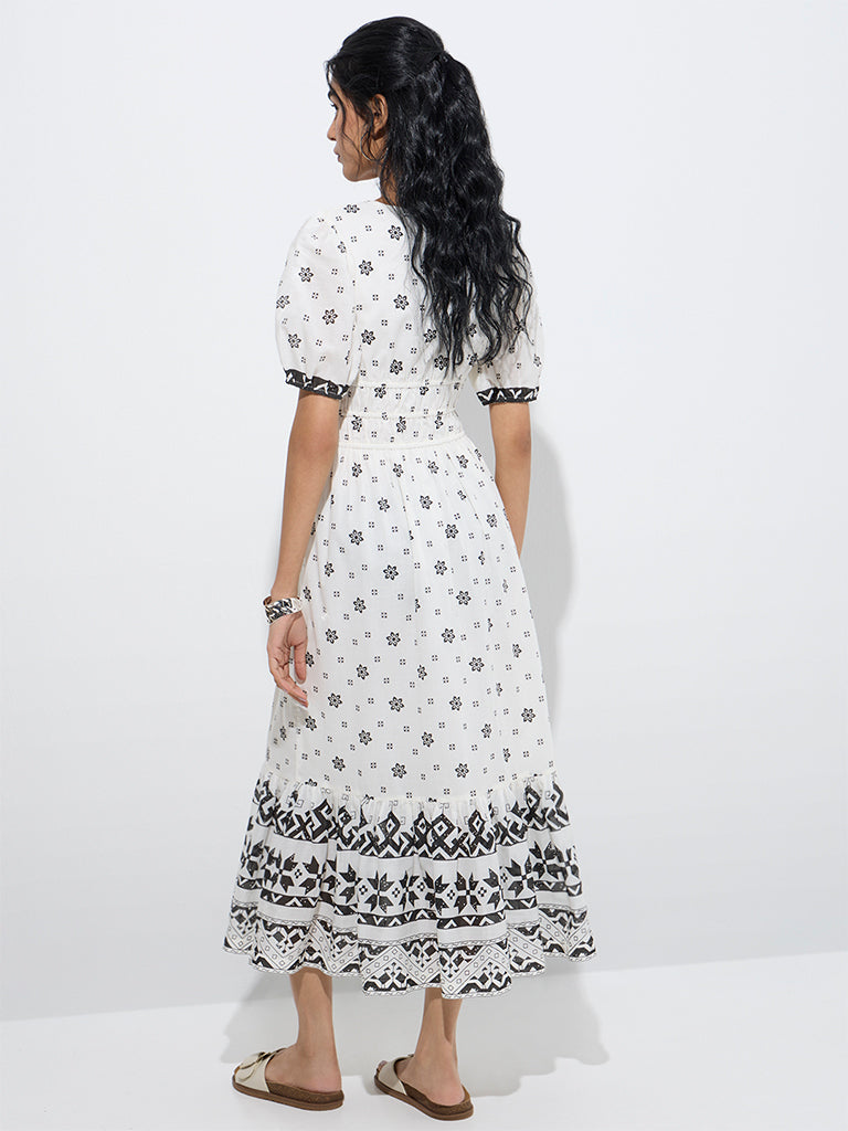 Bombay Paisley White Floral Design Cotton Tiered Dress