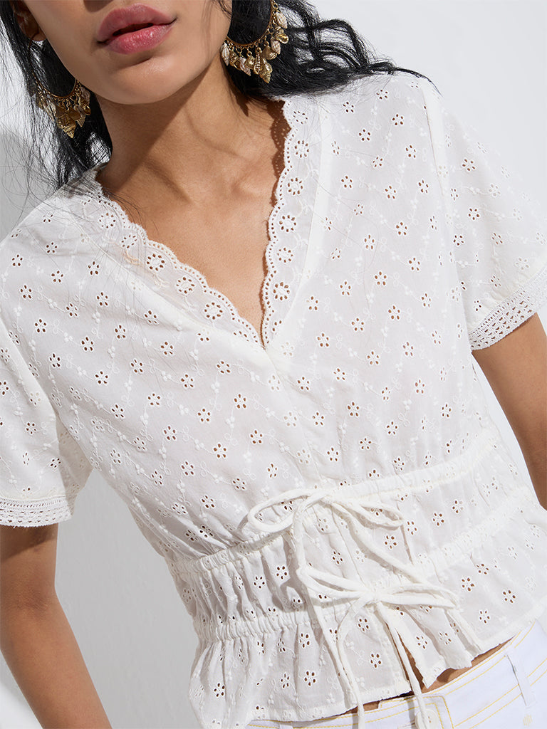 This white top from Bombay Paisley showcases intricate schiffli embroidery on a cotton-rich fabric. Designed with a V-neck adorned with scallop detailing and short sleeves accented with delicate crochet, it radiates a timeless appeal. The elasticated detailing at the waist lends a flattering look.