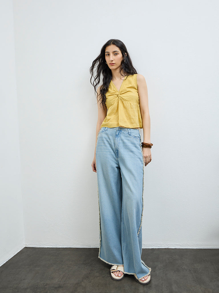 This yellow top from Bombay Paisley is crafted from pure cotton, bringing a light and summery feel. Styled with a V-neckline highlighted by delicate lace trims, it features gentle ruching at the front for added texture.