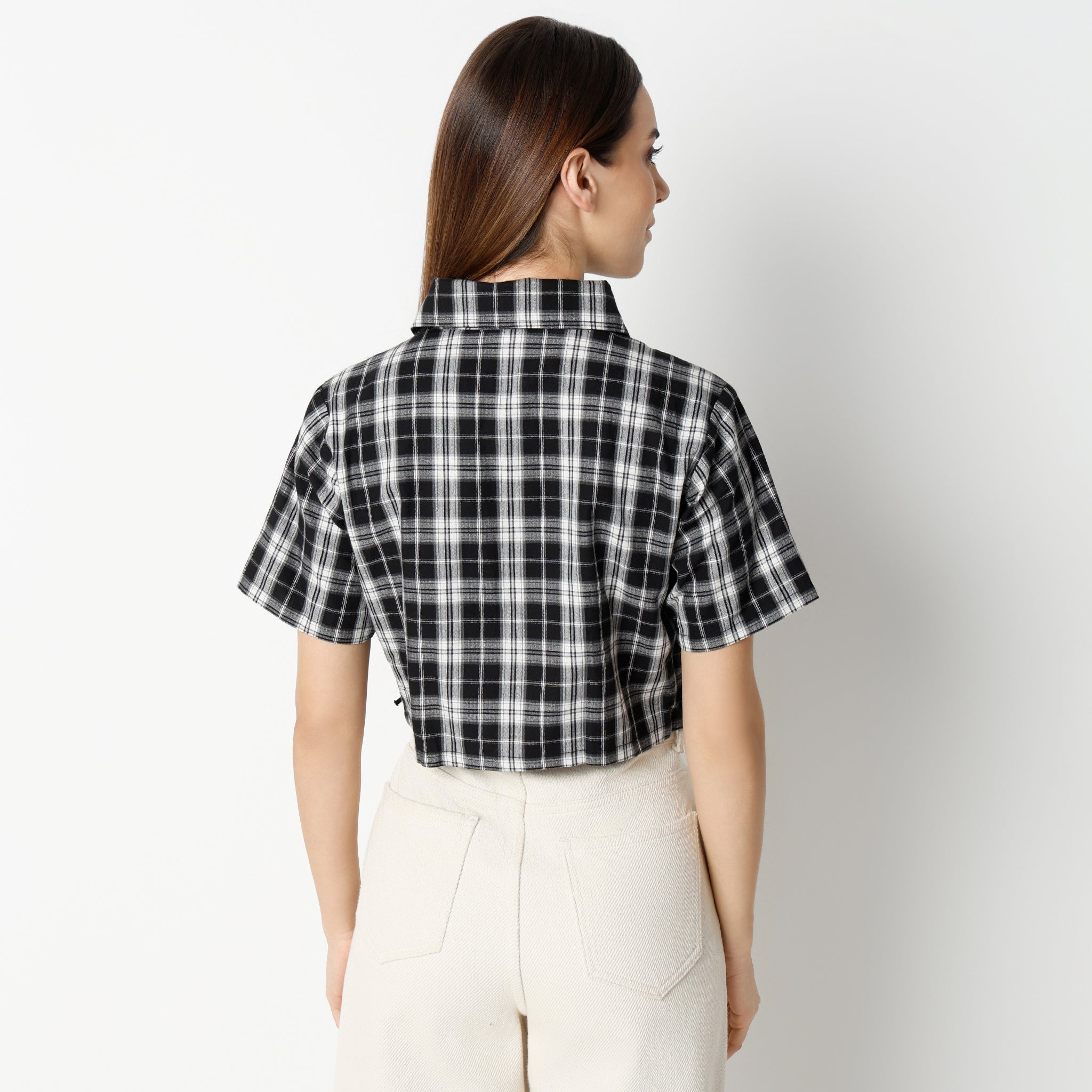 Experience the effortless charm of our Boxy Fit Checkered Short Sleeve Crop Shirt. Crafted from 100% cotton, this shirt offers a breathable and soft touch against your skin, ensuring all-day comfort. The checkered pattern adds a timeless appeal, while the cropped length and front lace tying bring a modern twist to your wardrobe.