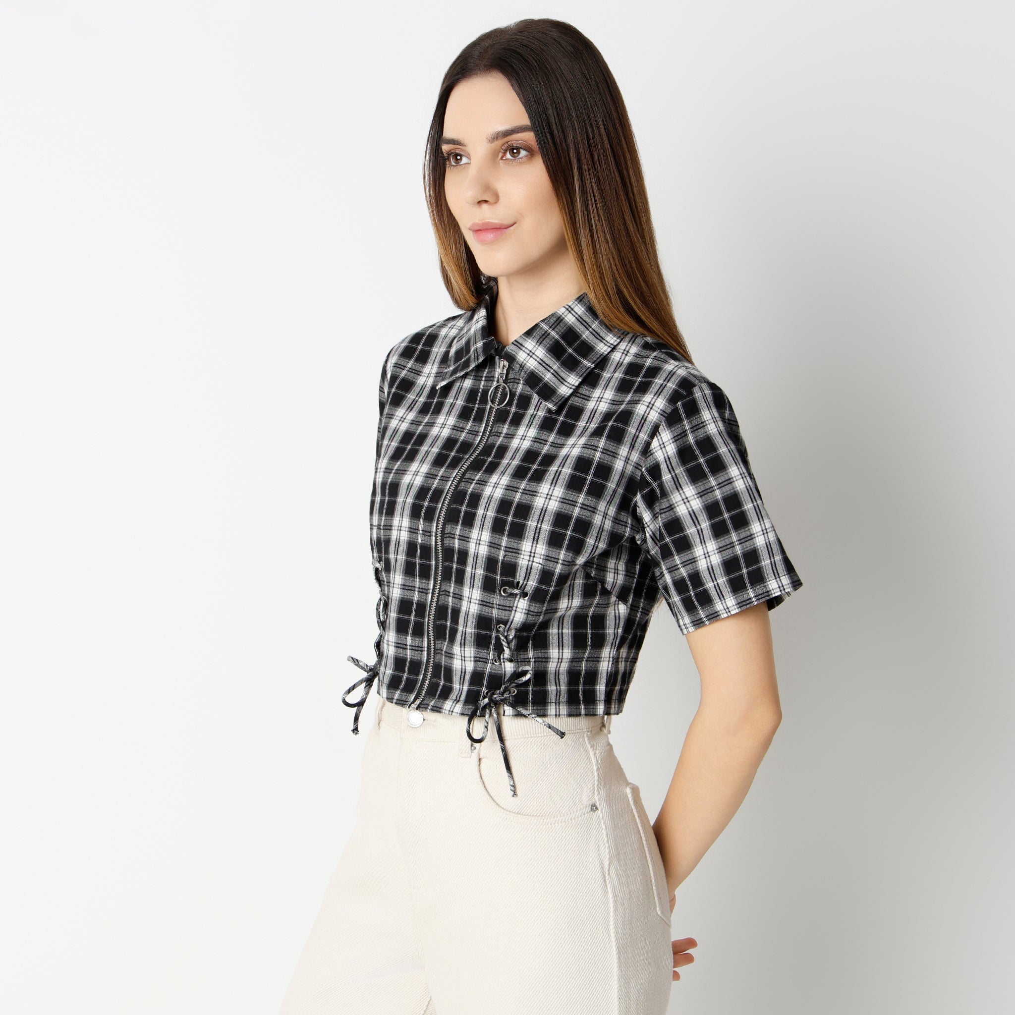 Boxy Fit Checkered Short Sleeve Crop Shirt With Front Lace Tying