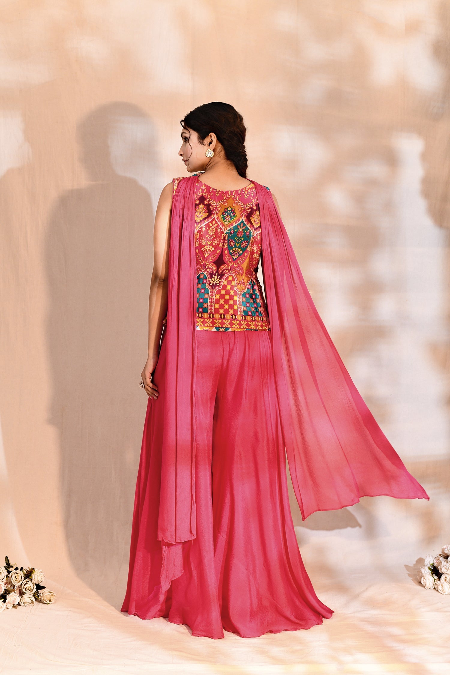 The bright pink tissue silk floral printed indo-western set with sequin work top for a stylish look with traditional touch.