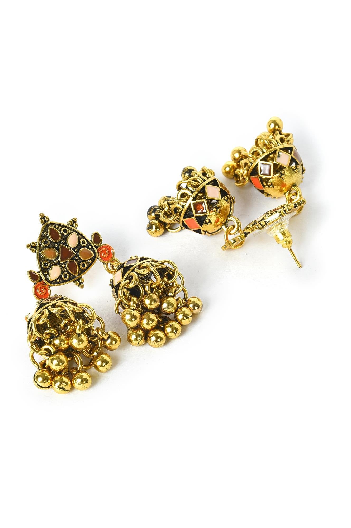 Festive Double Jhumki Gold Earrings With Modern Motifs Detailed With Brown And Orange Enamel