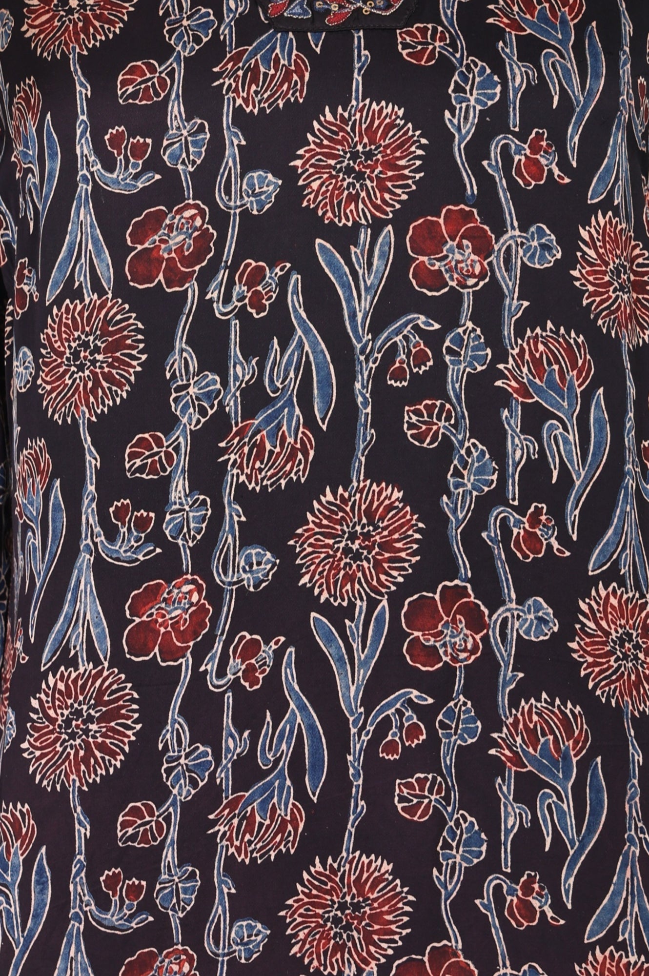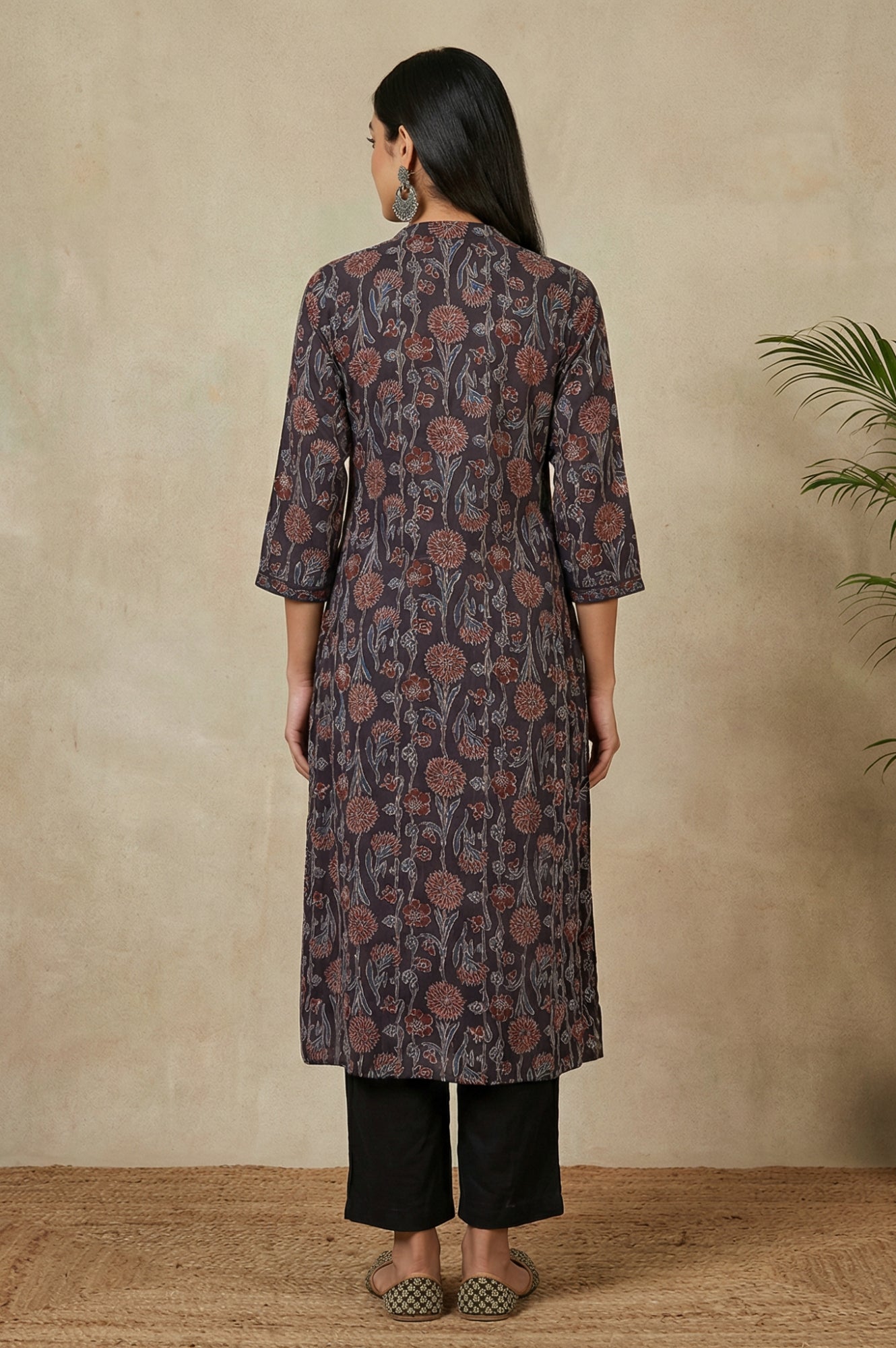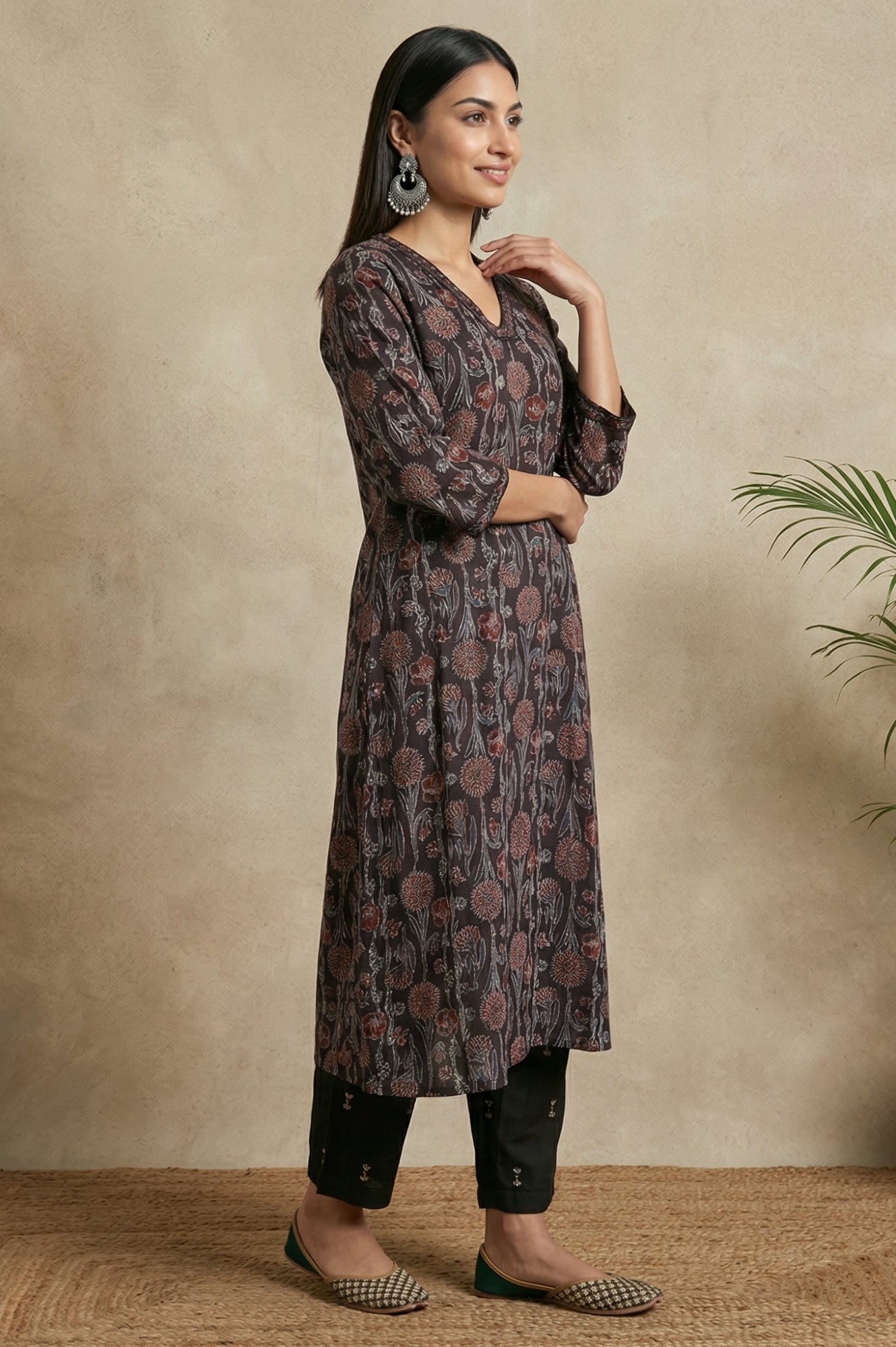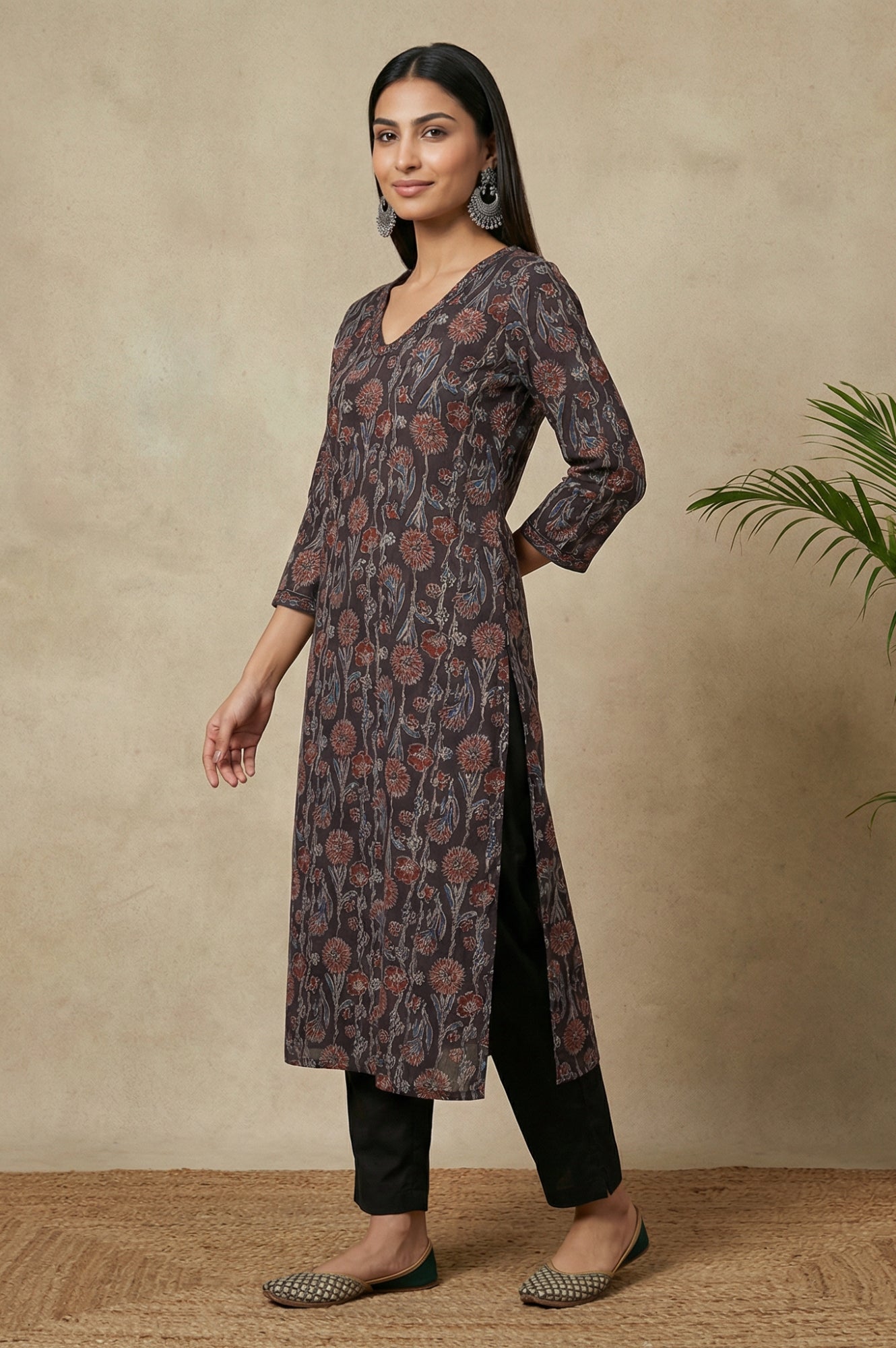 Crafted in rich brown satin with a striking all-over block print, this straight-fit kurta for women is a versatile addition to your smart casual wardrobe. The lightweight woven fabric flows beautifully, while delicate sequin ornamentation adds a hint of subtle shimmer to the V-neckline. Designed with side slits, three-quarter sleeves, and an opaque finish, it offers both comfort and effortless style for daily outings or informal gatherings. Pair this elegant ethnic wear for women with contrasting bottoms for a refined daytime look.