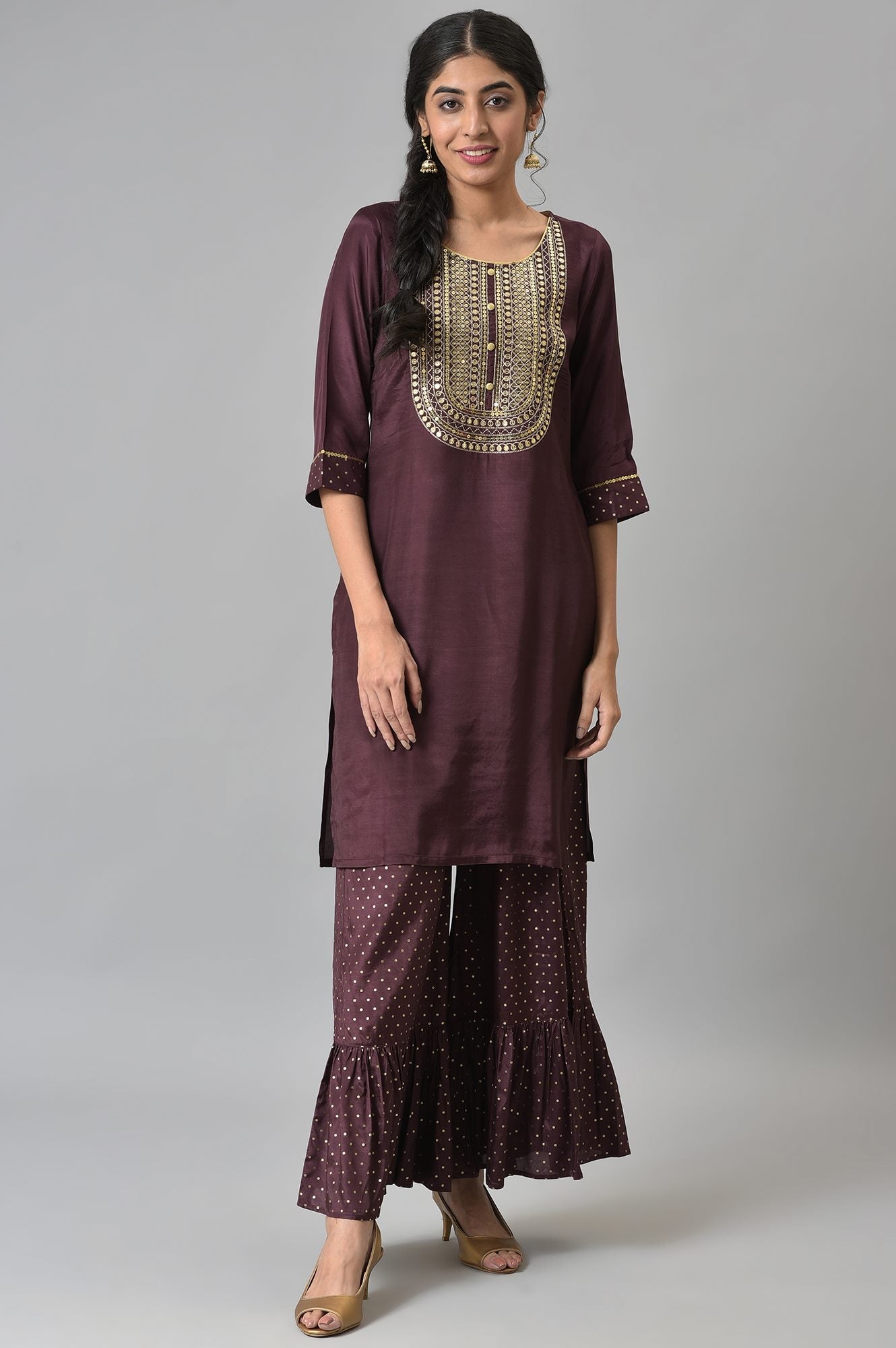 Impactful and striking, two piece LIVA kurta and sharara set includes a short embroiderd kurta and an embroidered narrow palazzo. The embroidery is finely detailed and uses a variety of stitches to give it a contemporary look. Its definately a perfect style that'll make you instantly put together.