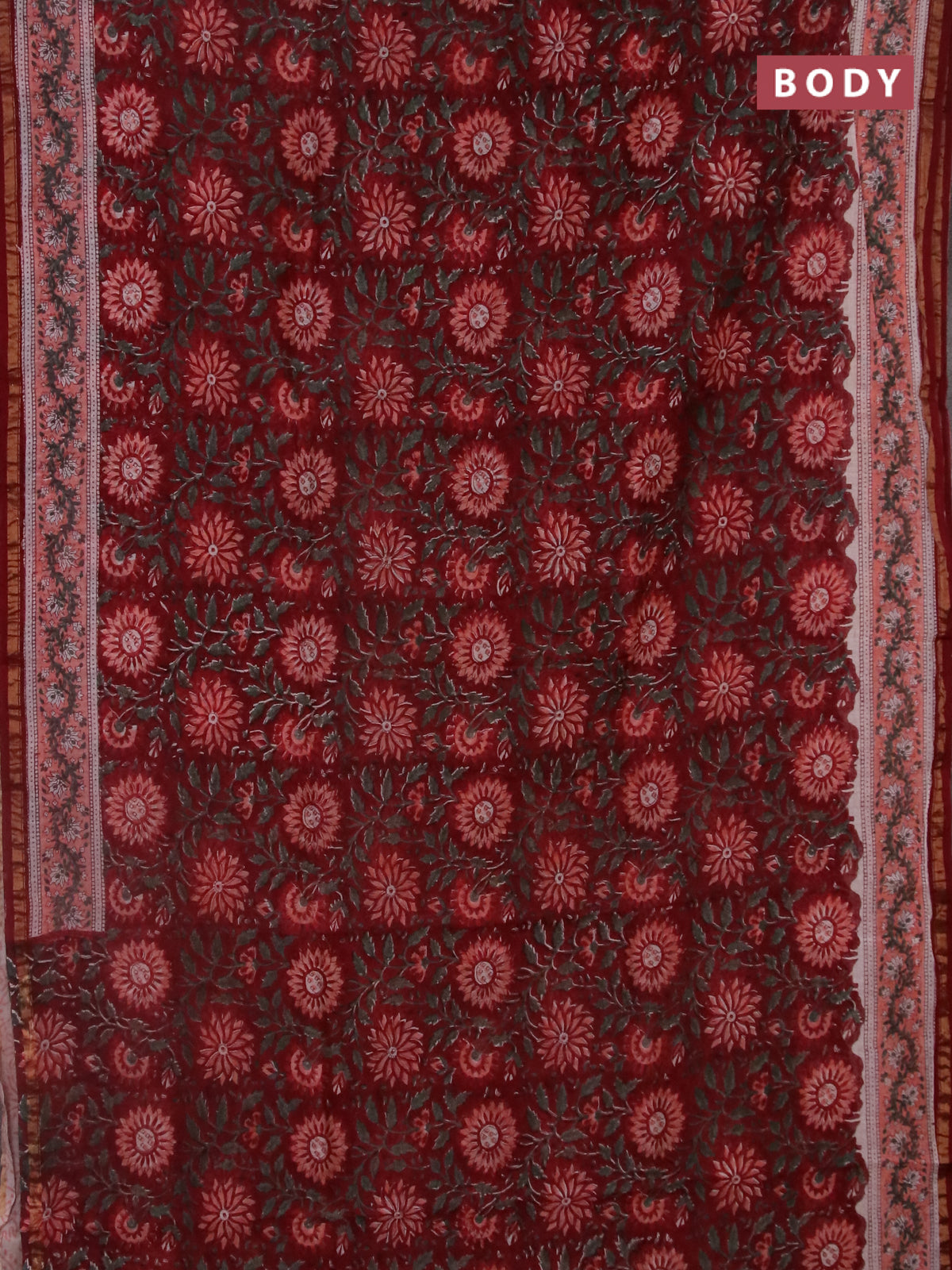 Chanderi bagru saree maroon and peach orange with allover prints and zari woven border