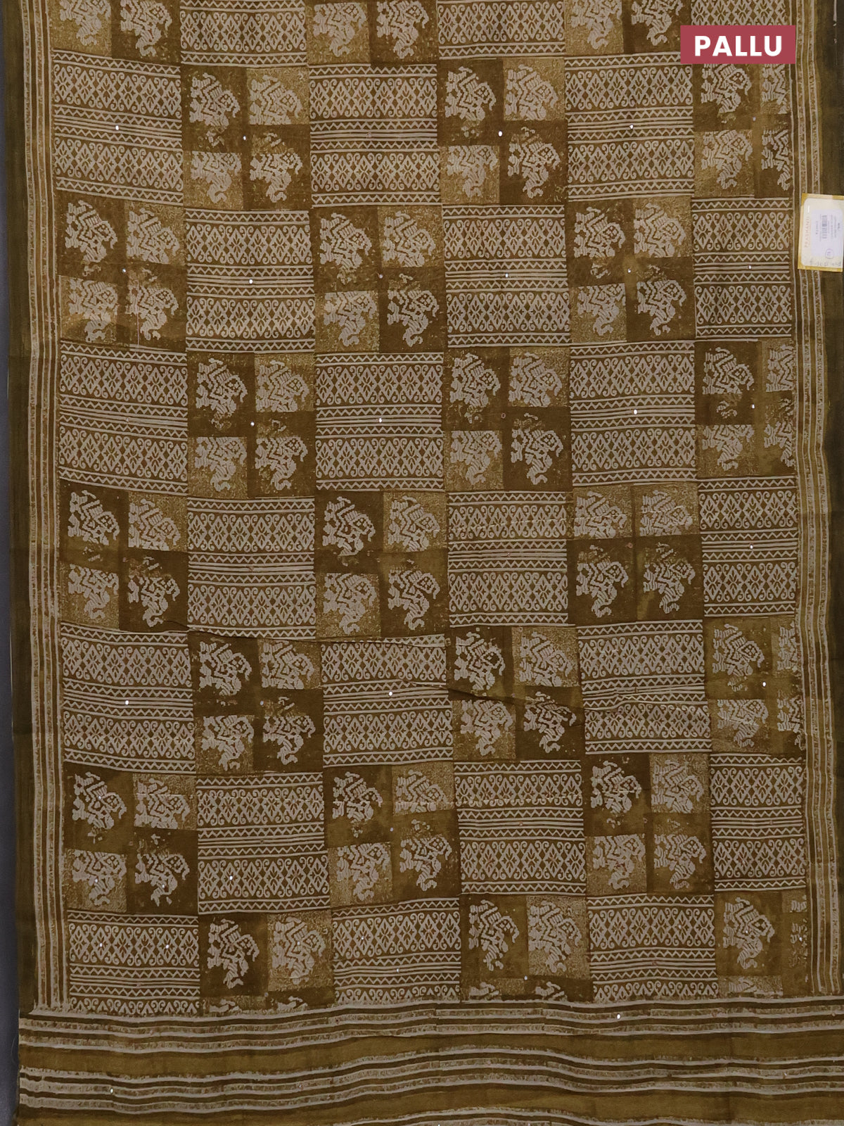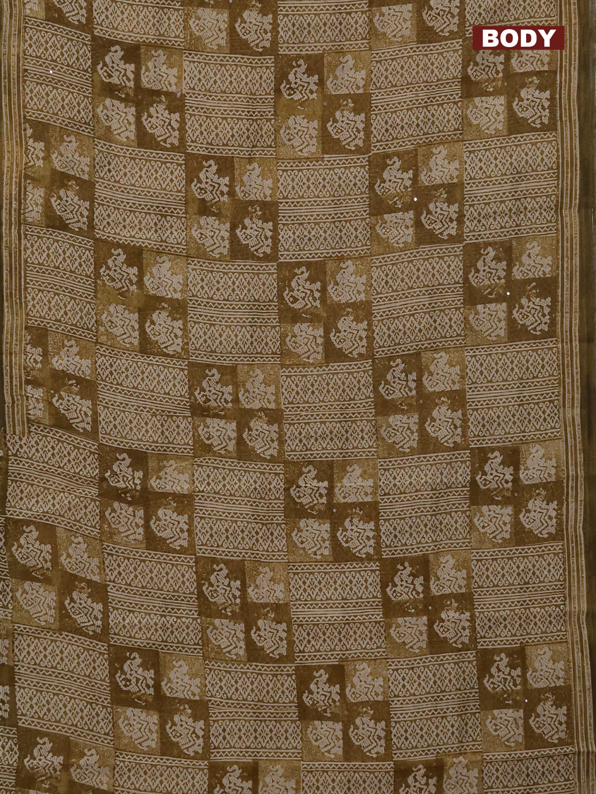 Chanderi silk cotton saree mehendi green and beige with allover prints & mirror work and printed border