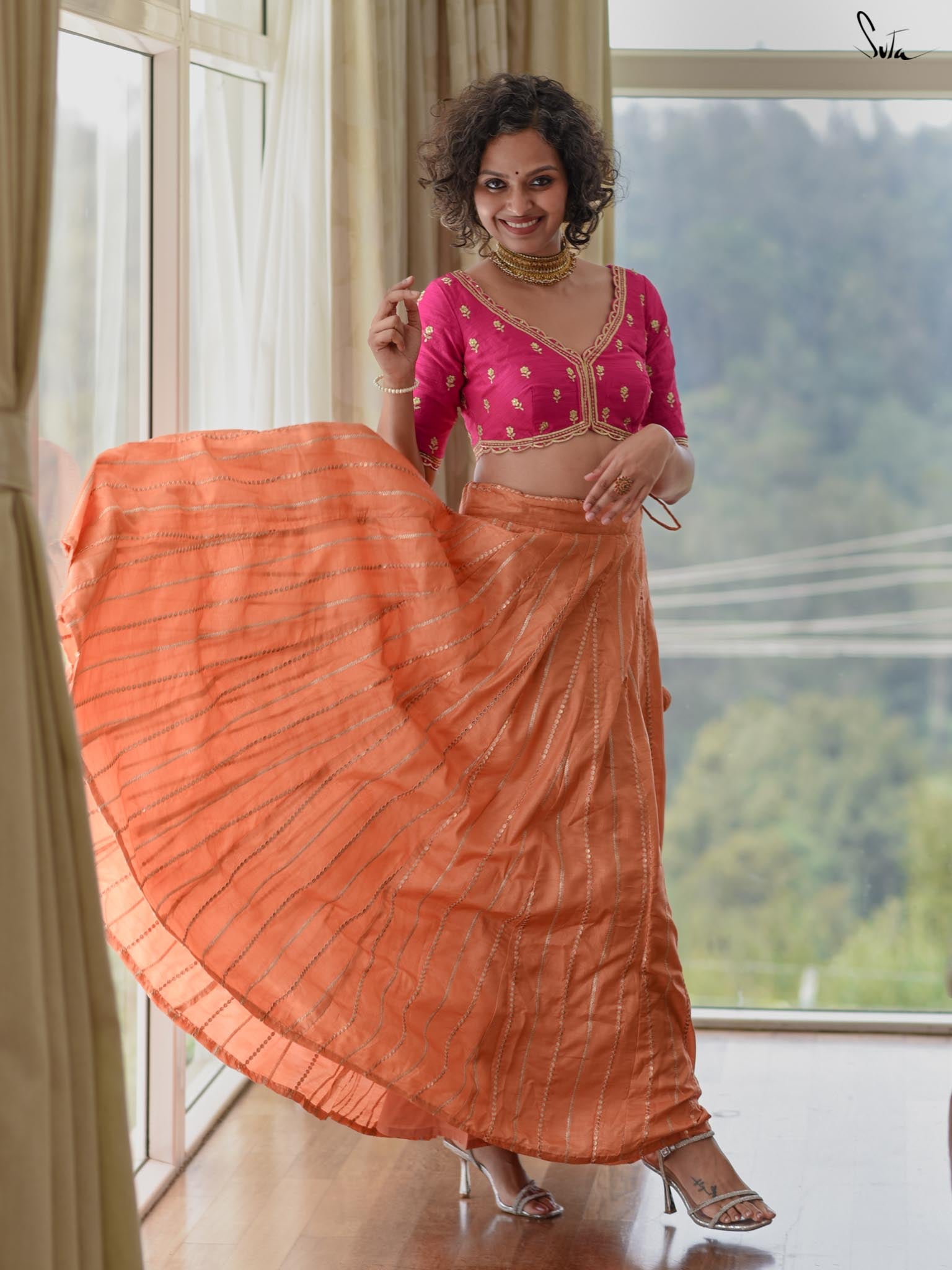 Unleash your personal flair with the 'Chandra Kanti' lehenga, featuring a soothing peach colour that wins hearts. This machine sequin embroidered lehenga is made up of art silk fabric, and features a side zip and knot opening, ensuring ease and comfort like never before.