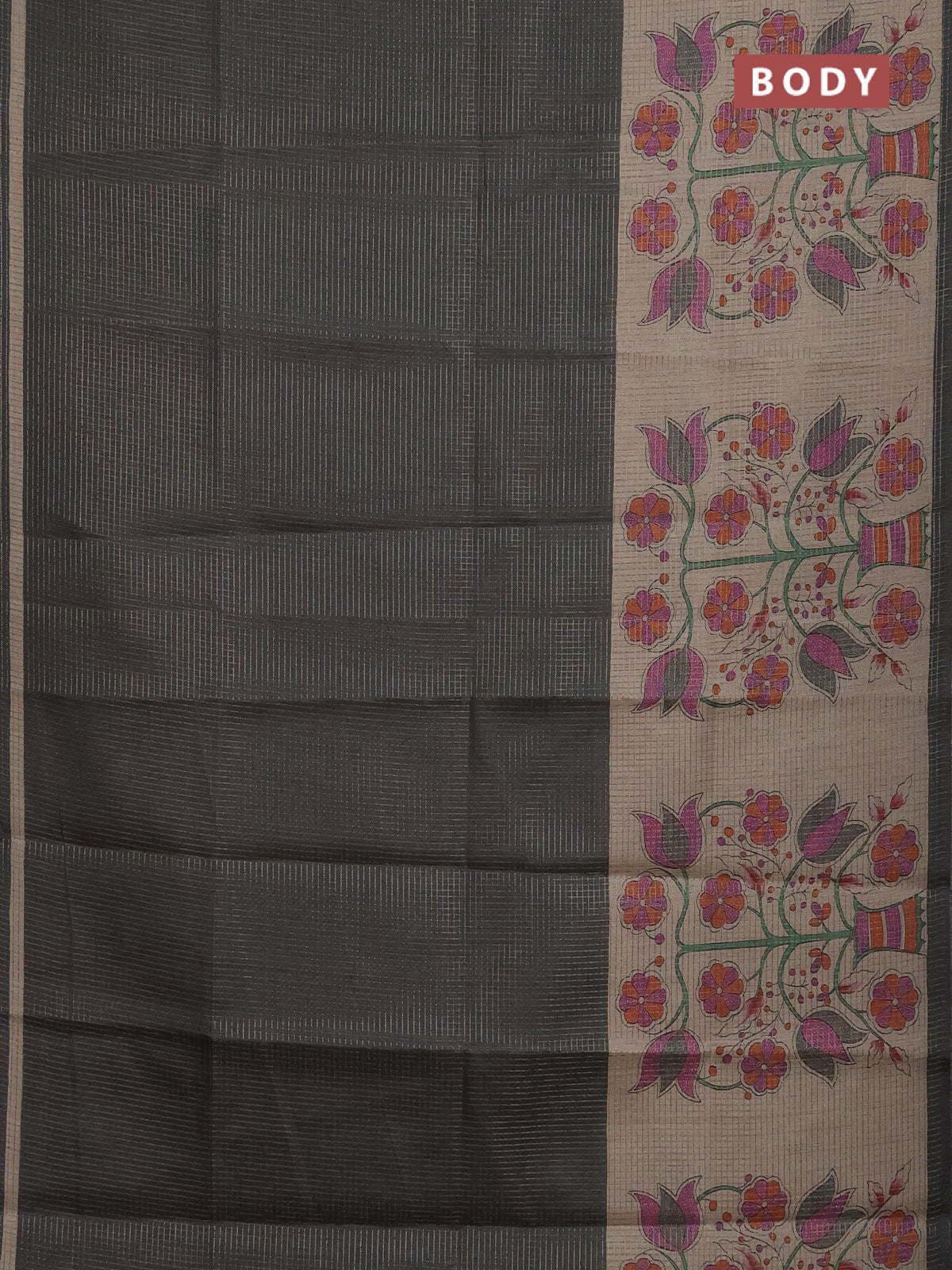 Chappa saree grey and beige with allover small zari checked pattern and floral digital printed pallu