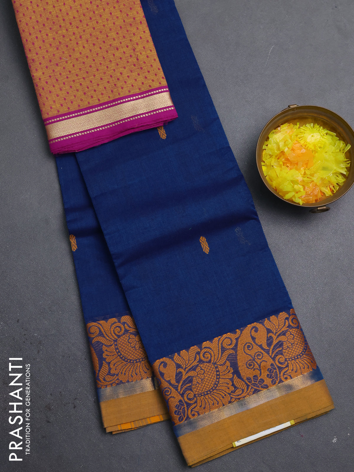 Chettinad cotton saree peacock blue and dark mustard with thread woven buttas and thread woven simple border