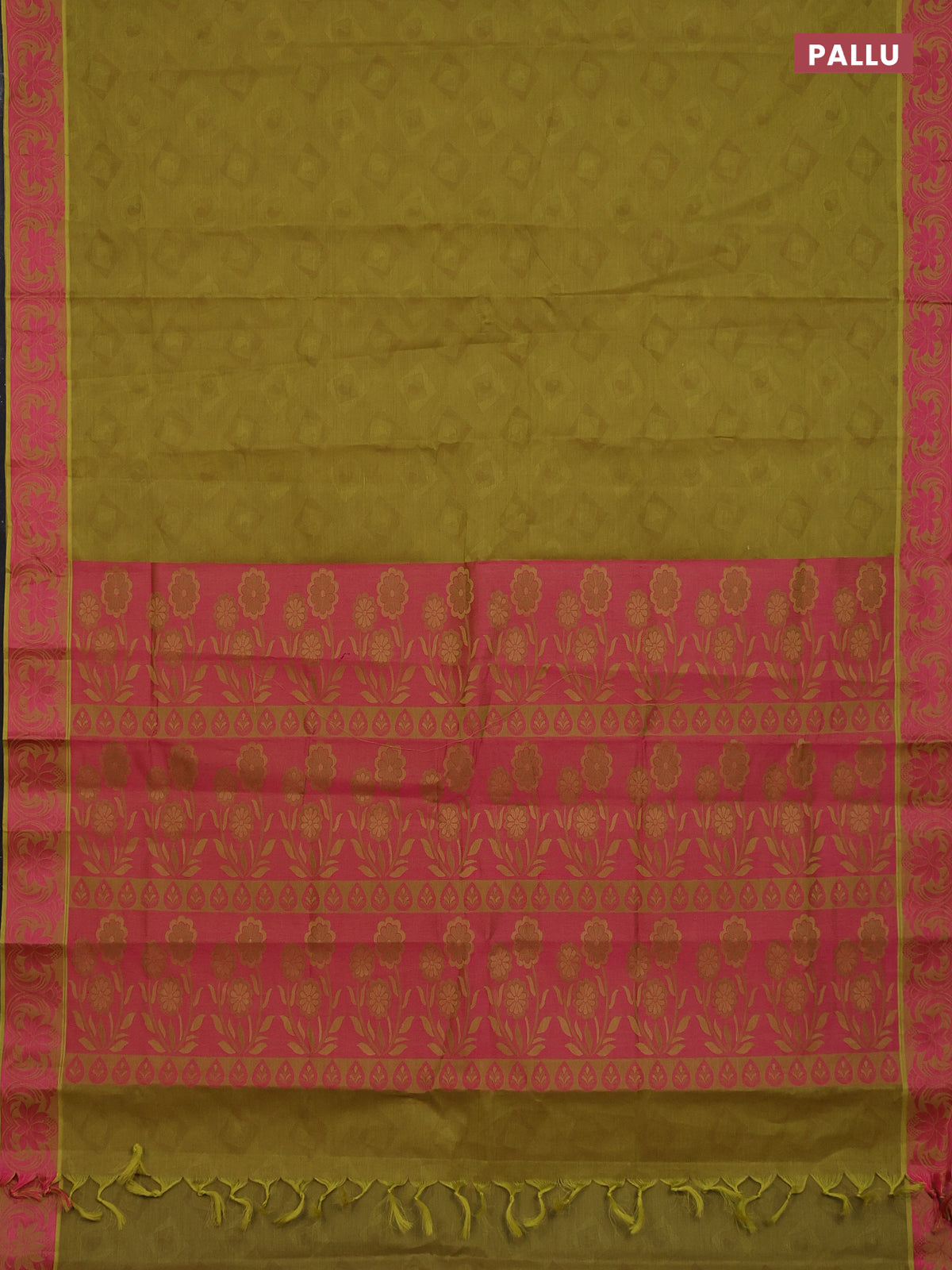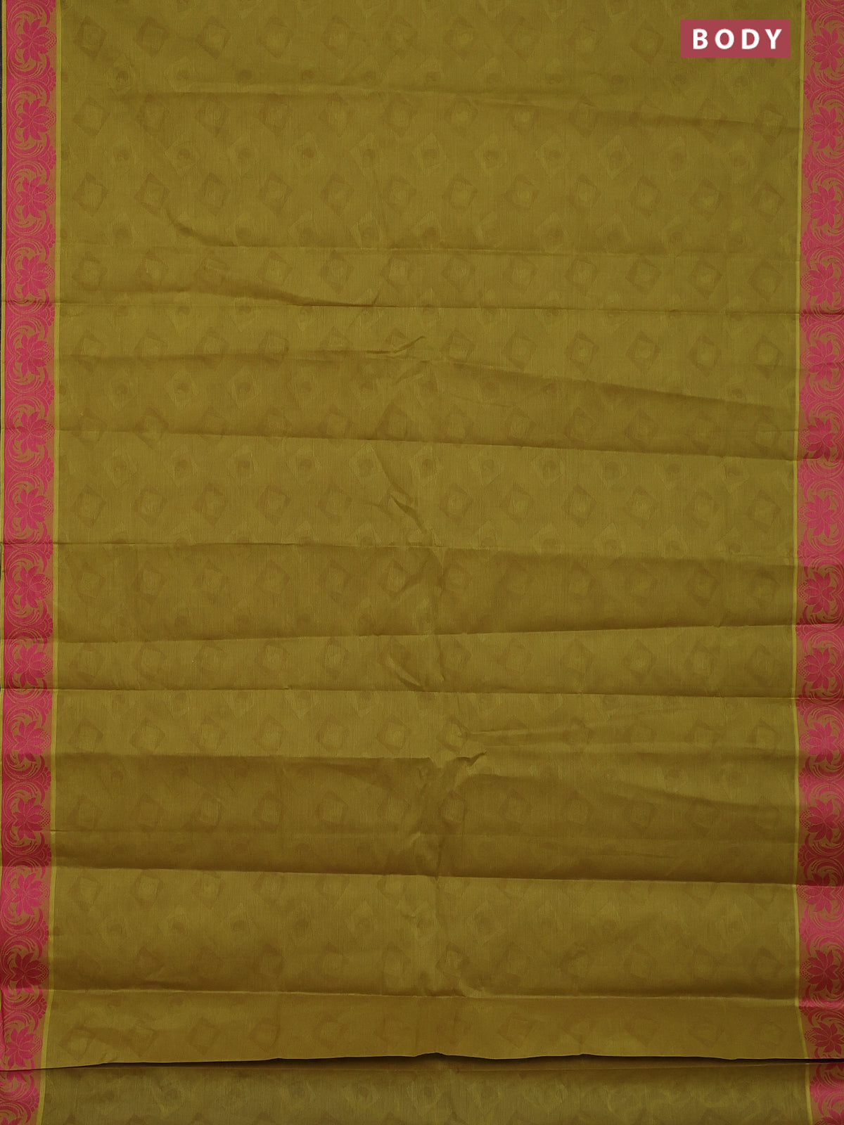 Coimbatore cotton saree mustard green and pink with allover self emboss and thread woven border