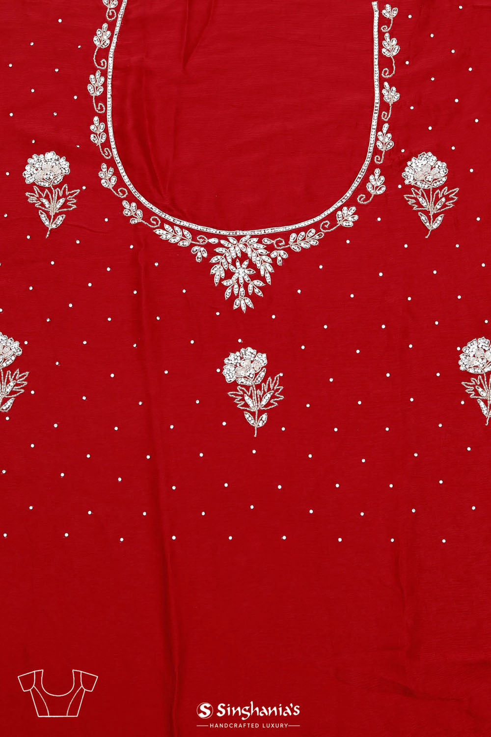 A gorgeous deep red saree with a silk base, which features floral jaal embroidered pattern. Added with intricately embroidered border and pallu, crafted with sequins and glass beads. It’s an excellent choice for festivals, receptions and grand celebrations.