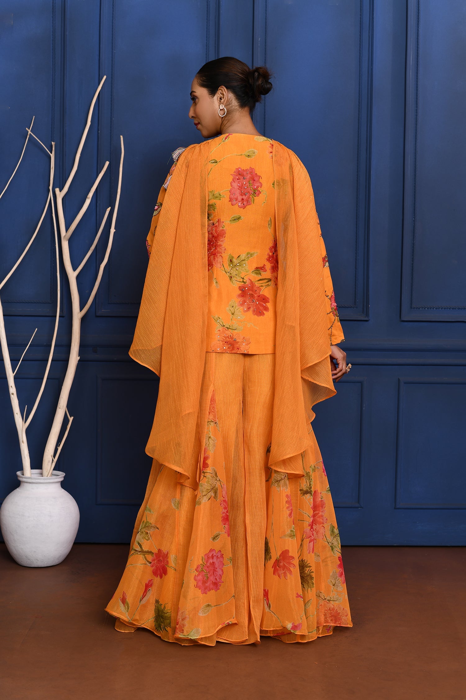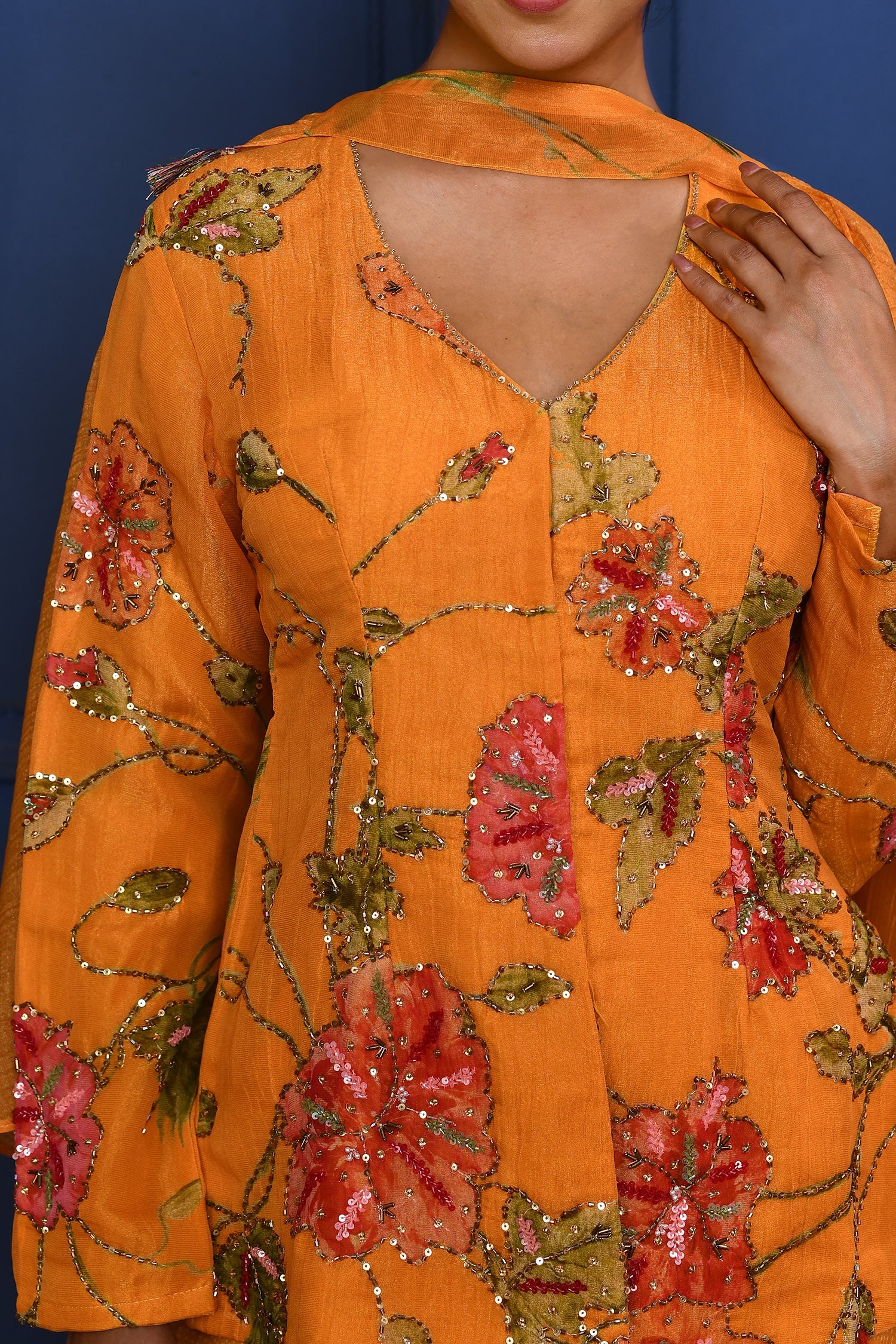 The deep yellow floral tissue peplum set with cutdana and sequin embroidery along with georgette dupatta and bottom for a stylish ethnic look .