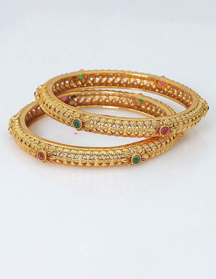 A stunning pair of gold-finish bangles adorned with intricate floral carvings and vibrant red and green stone accents—perfect for festive elegance or timeless tradition.