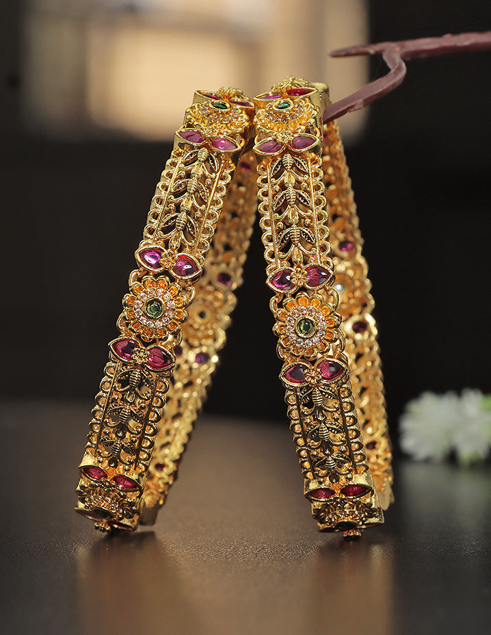 Elegant Matt Kempu plated bangles, embellished with dazzling Ruby, Emerald & White CZ stones. Perfect for any occasion – stand out in style, whether it's a party or a traditional event!