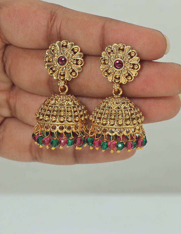Add a touch of glam to your Indian fits with these classic CZ matte polish jhumkas. Elegant, timeless, and adorned with kempu, ruby & emerald stones – a true stunner!