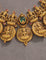 The Designer Matt Lakshmi Devi Kasula Kempu Necklace Set caters to customers who appreciate traditional South Indian jewelry with intricate temple-inspired designs. It attracts those seeking timeless elegance and cultural depth in their statement pieces.