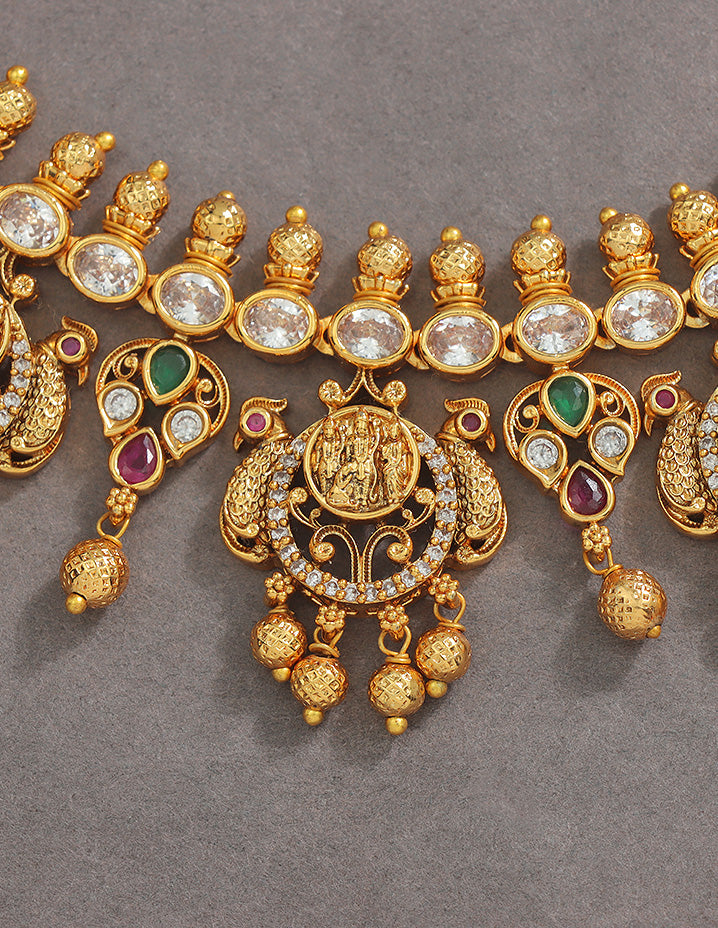 Elevate your traditional attire with the Designer Ramparivar Long Haaram Set, featuring a matt antique polish that enhances its timeless elegance. Crafted with intricate detailing, this long haaram complements both festive and ceremonial occasions, adding a sophisticated touch to your ensemble. Its classic design ensures versatility and lasting appeal, making it a valuable addition to your designer jewellery collection.