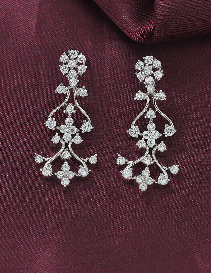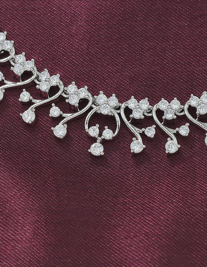 A radiant rhodium-toned necklace and earring set adorned with sparkling Bud and floral motifs, perfectly blending elegance and charm for your special occasions.