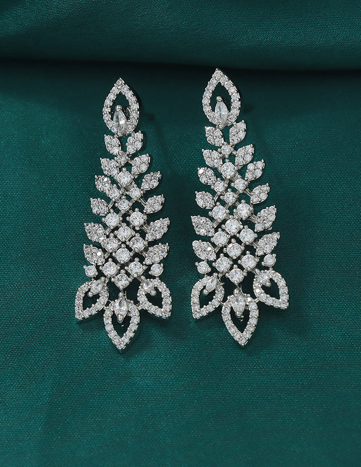 This Designer Zirconia Elegance Necklace Set features sparkling white stones enhanced by a durable rhodium polish. Its refined craftsmanship adds a sophisticated glow to any ensemble.