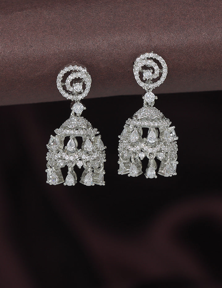 Designer earrings are classic jhumka-style danglers with a fusion of traditional and contemporary design. The bell-shaped drop is richly embellished with white stones and tear-drop dangles, paired with a sparkling oval top.