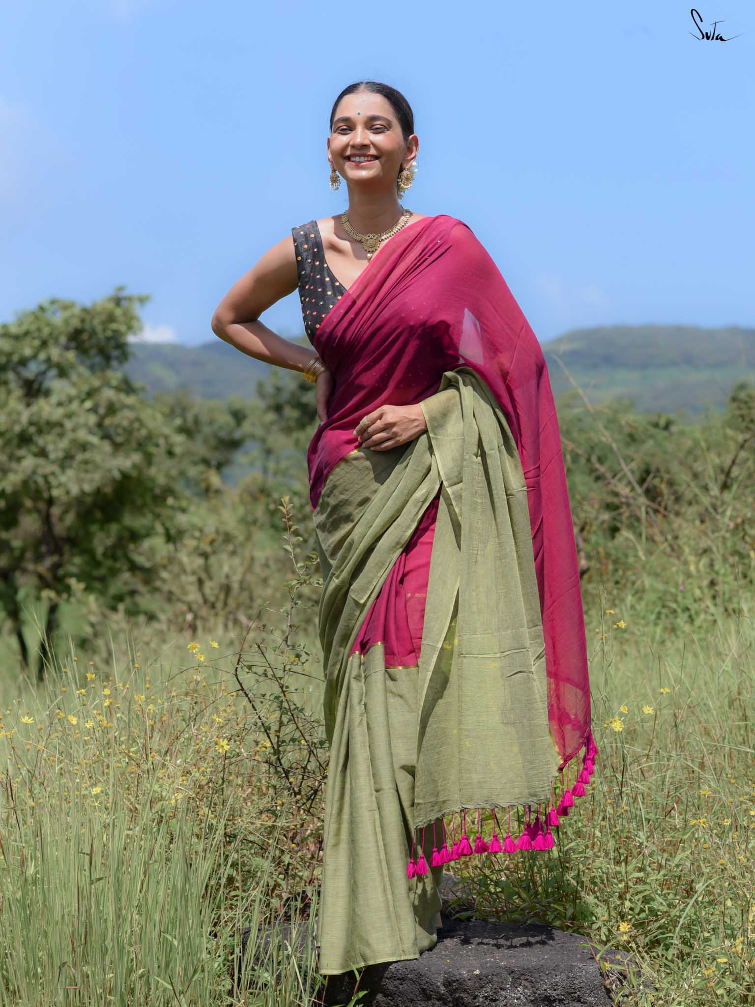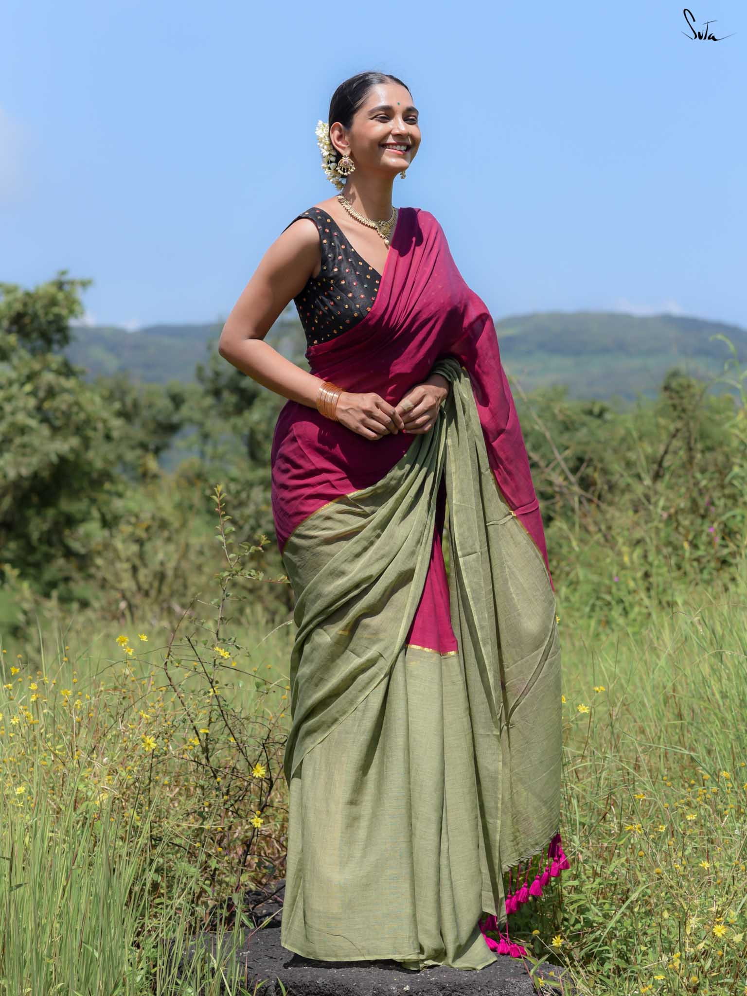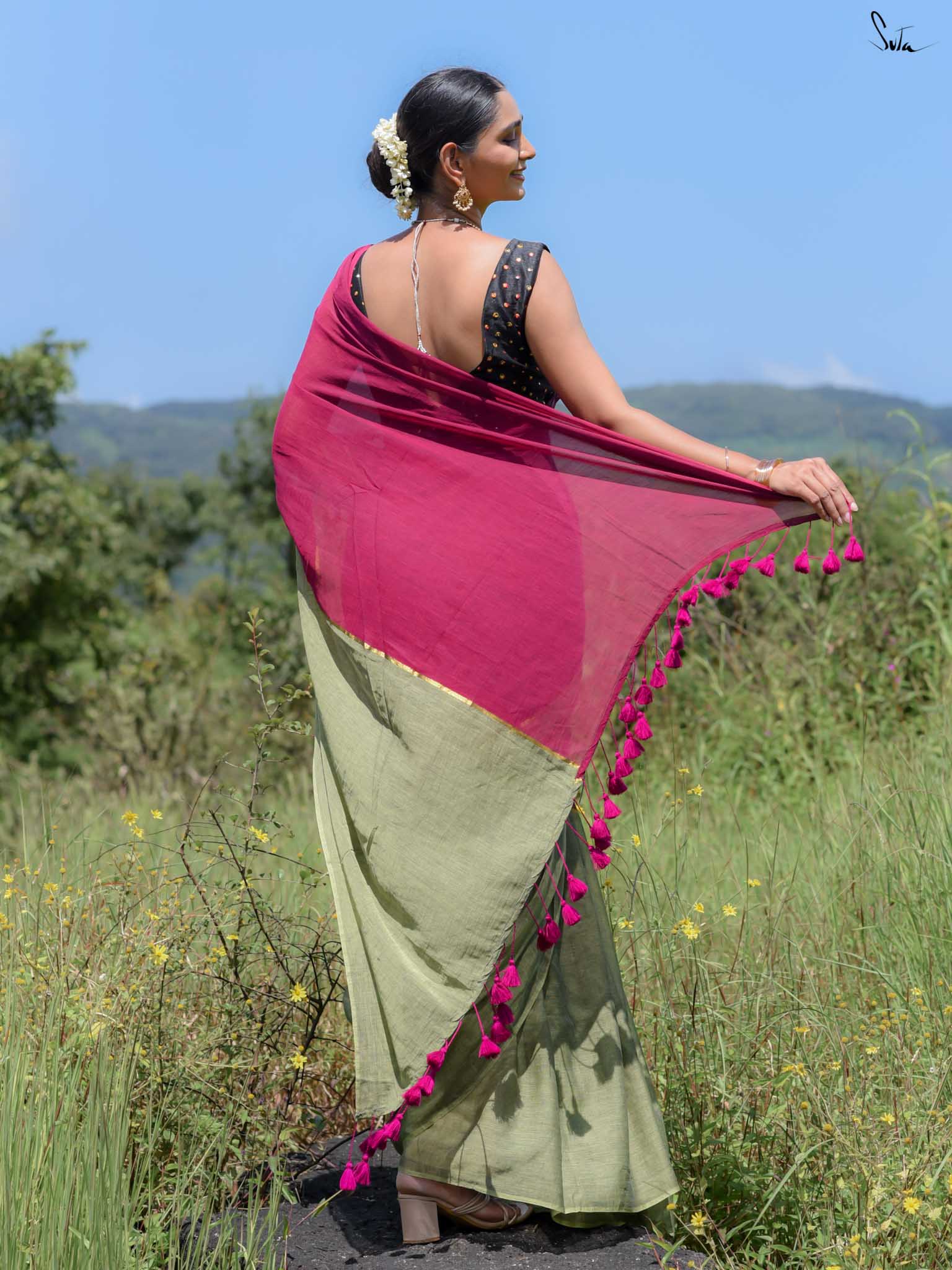 Celebrate vibrant contrasts with Dipped in Gulaab, a mul cotton saree that brings together pink and green in a striking half-and-half design. The center is highlighted with a delicate zari stripe, adding a subtle shimmer that enhances the elegance of the drape. Woven with care, this saree combines artisanal craftsmanship with everyday comfort, making it perfect for festive occasions or wedding celebrations.