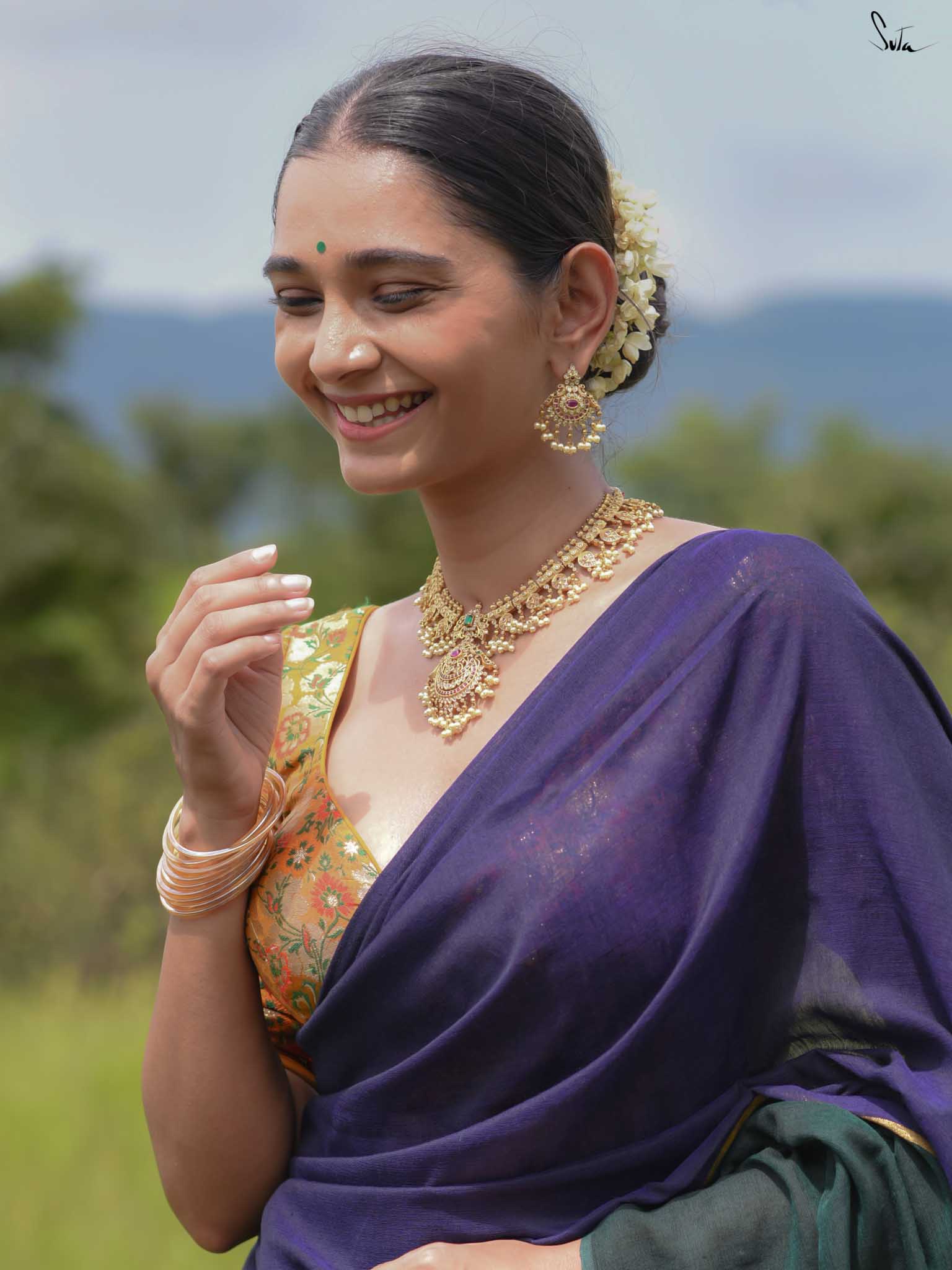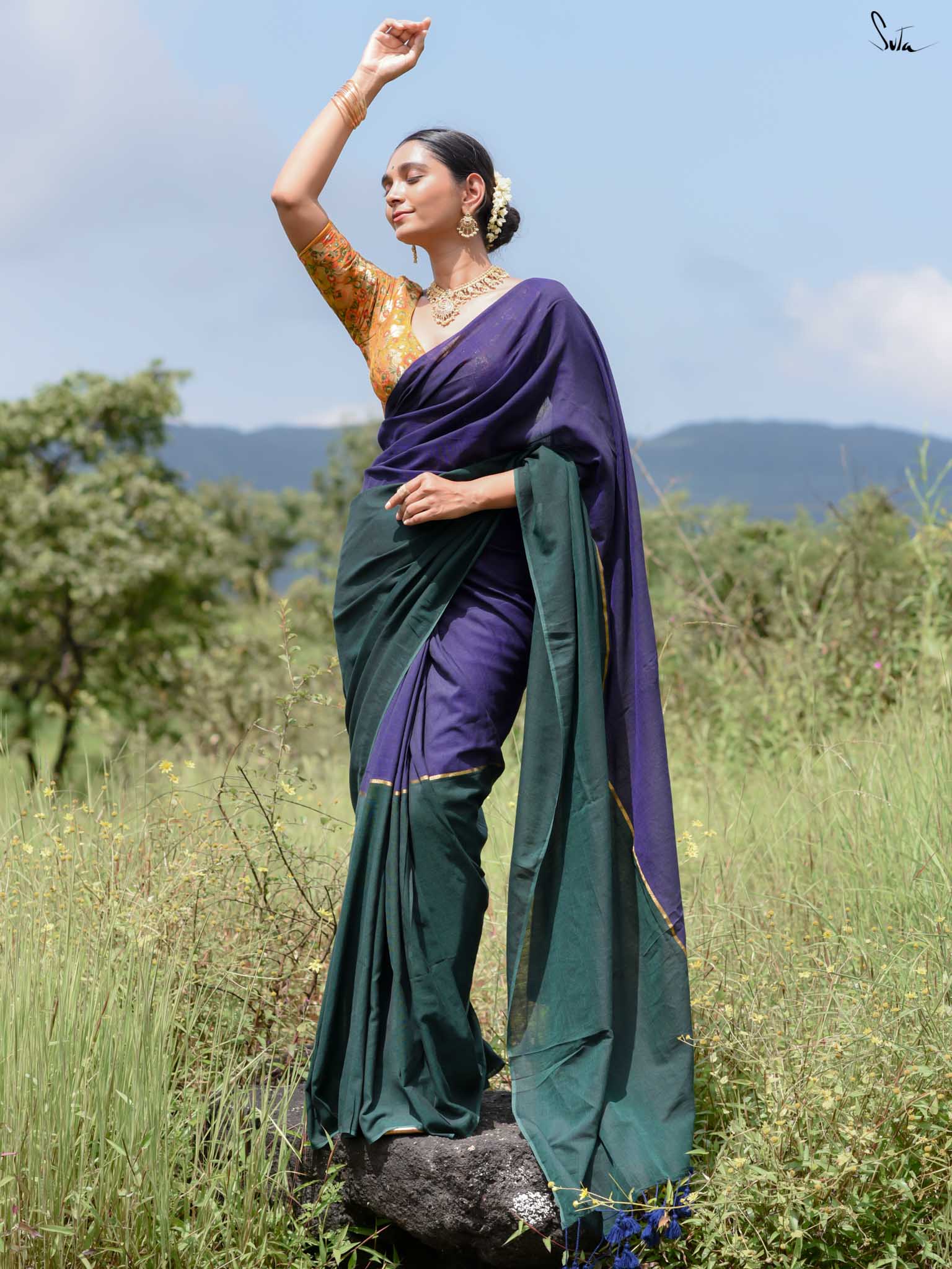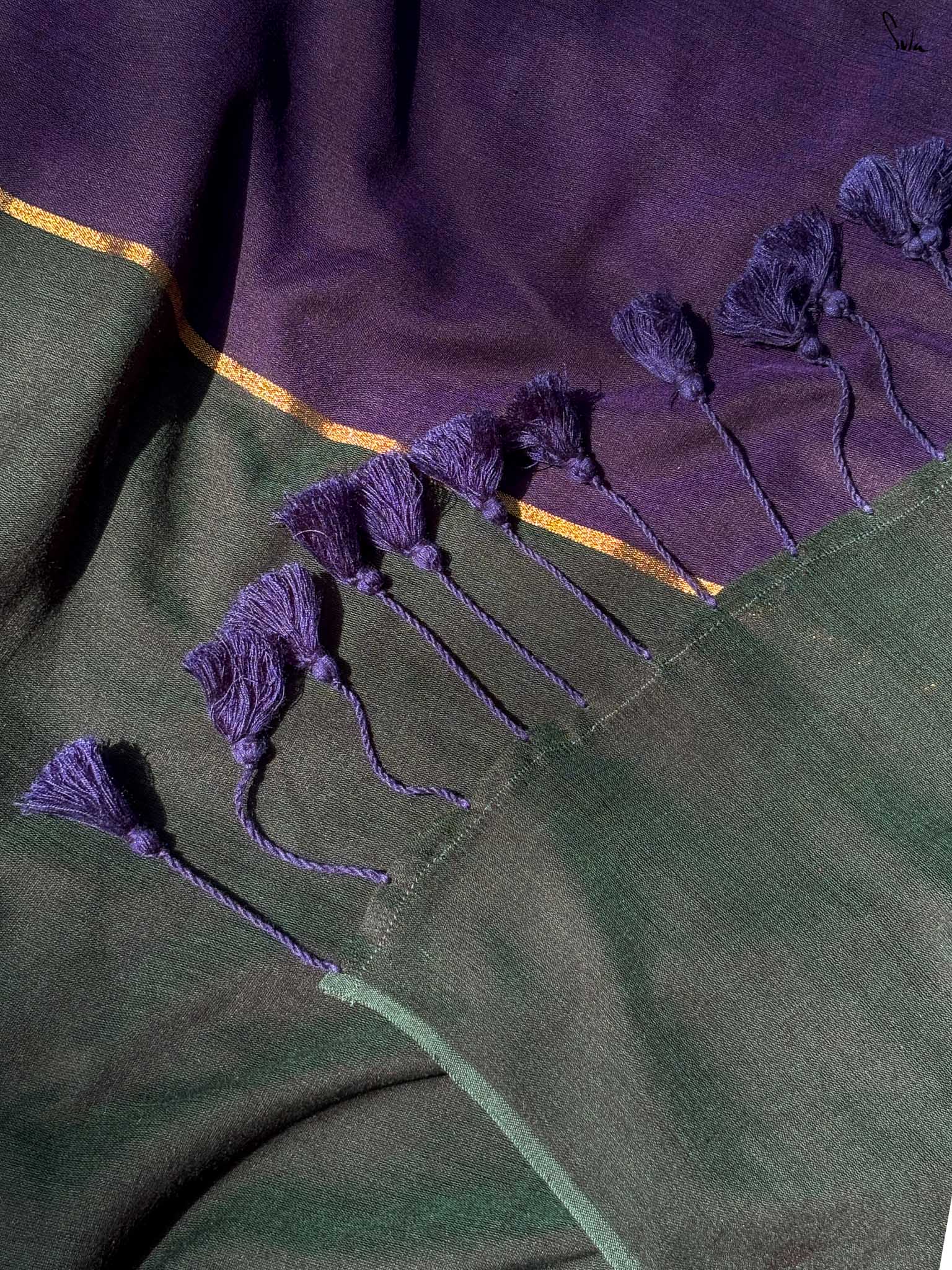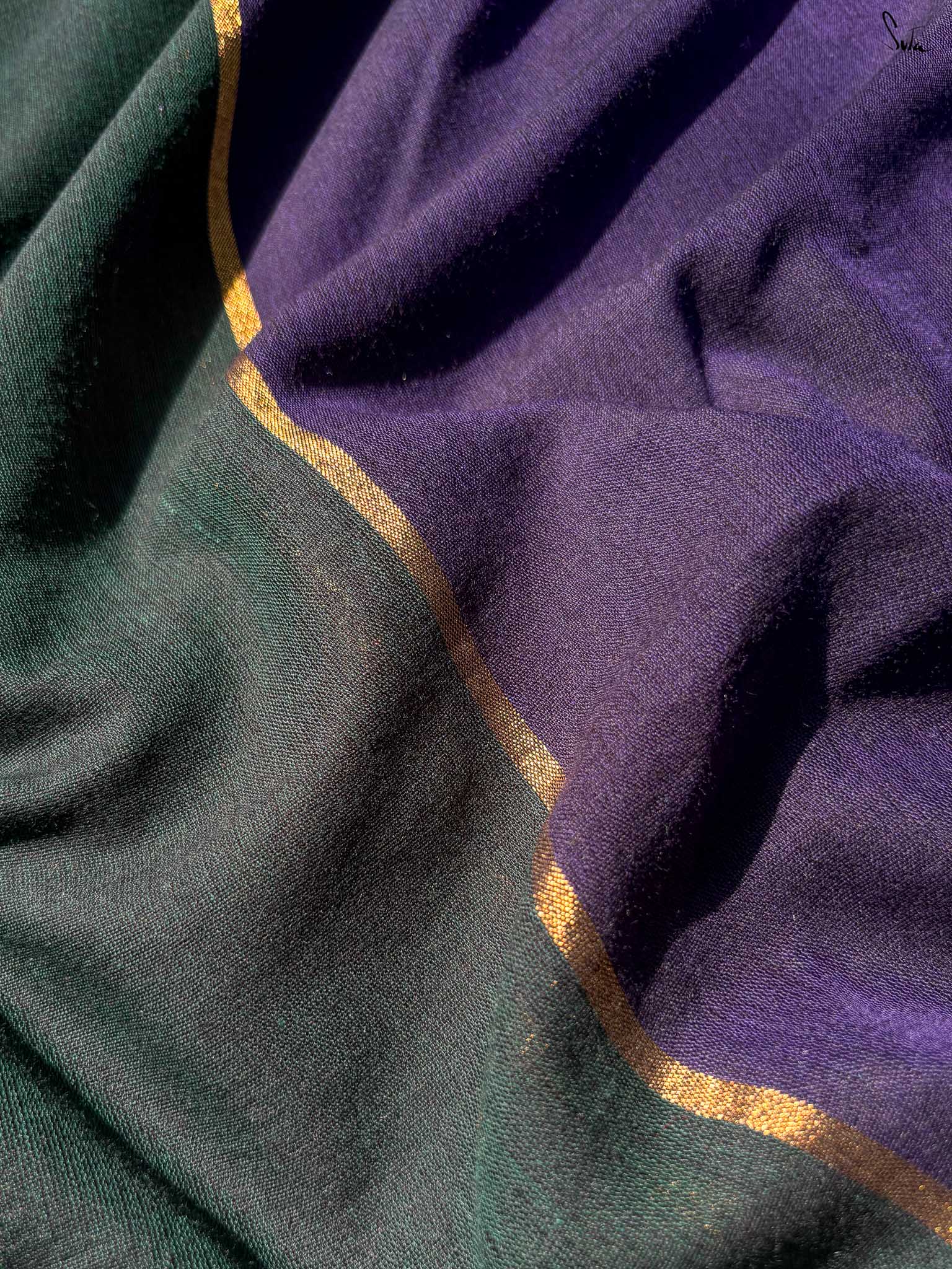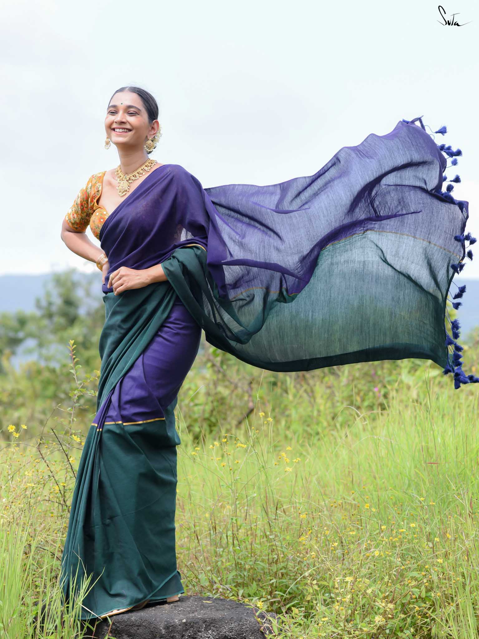 Celebrate color and craftsmanship with Dipped in Mulberry, a cotton-acrylic saree in a bold green-and-blue half-and-half design. A subtle zari stripe runs through the center, adding a touch of shimmer that elevates the saree’s festive charm. Woven carefully, it strikes the perfect balance between elegance and vibrancy - ideal for weddings, celebrations, or any occasion that calls for a statement drape.