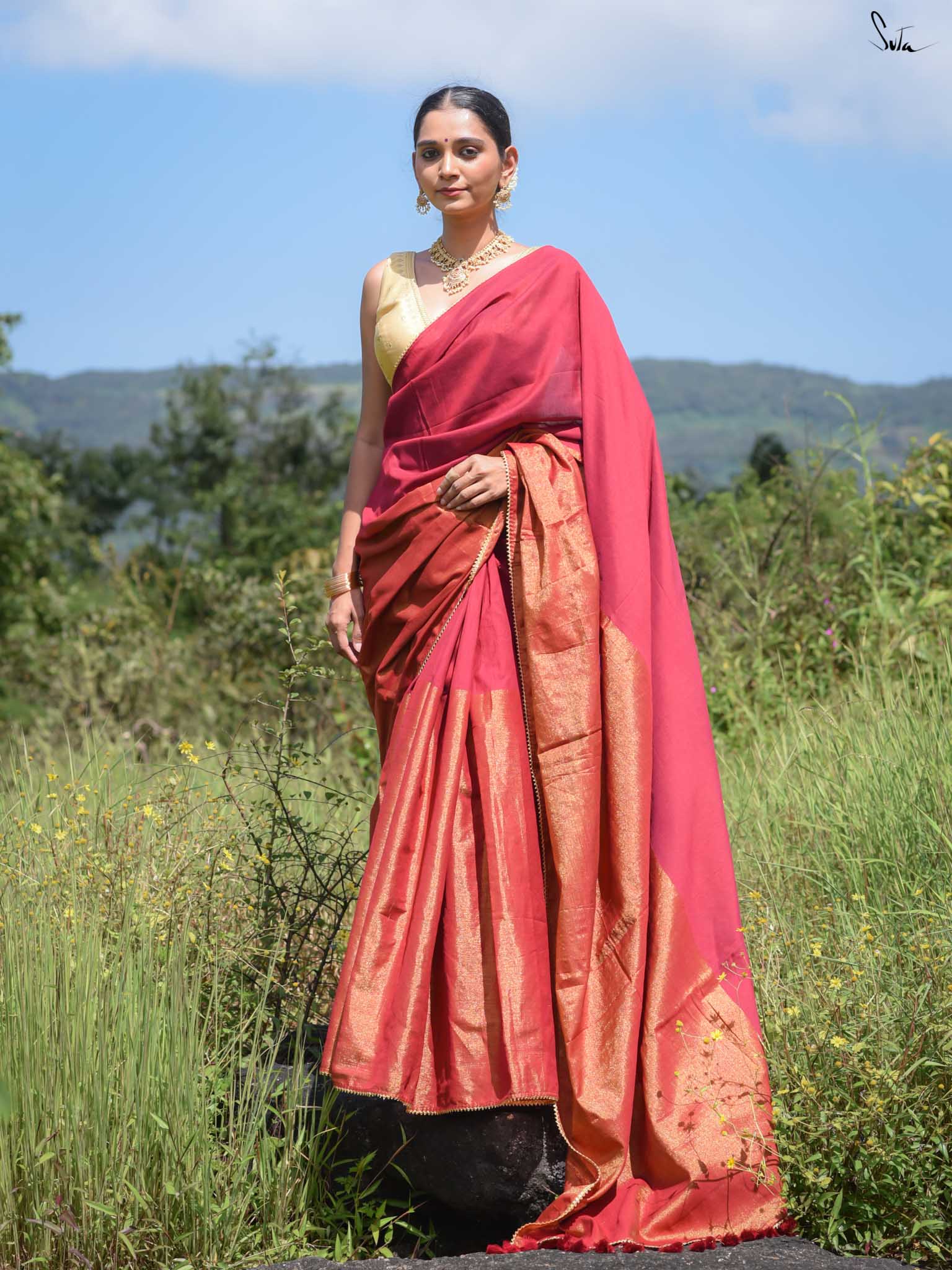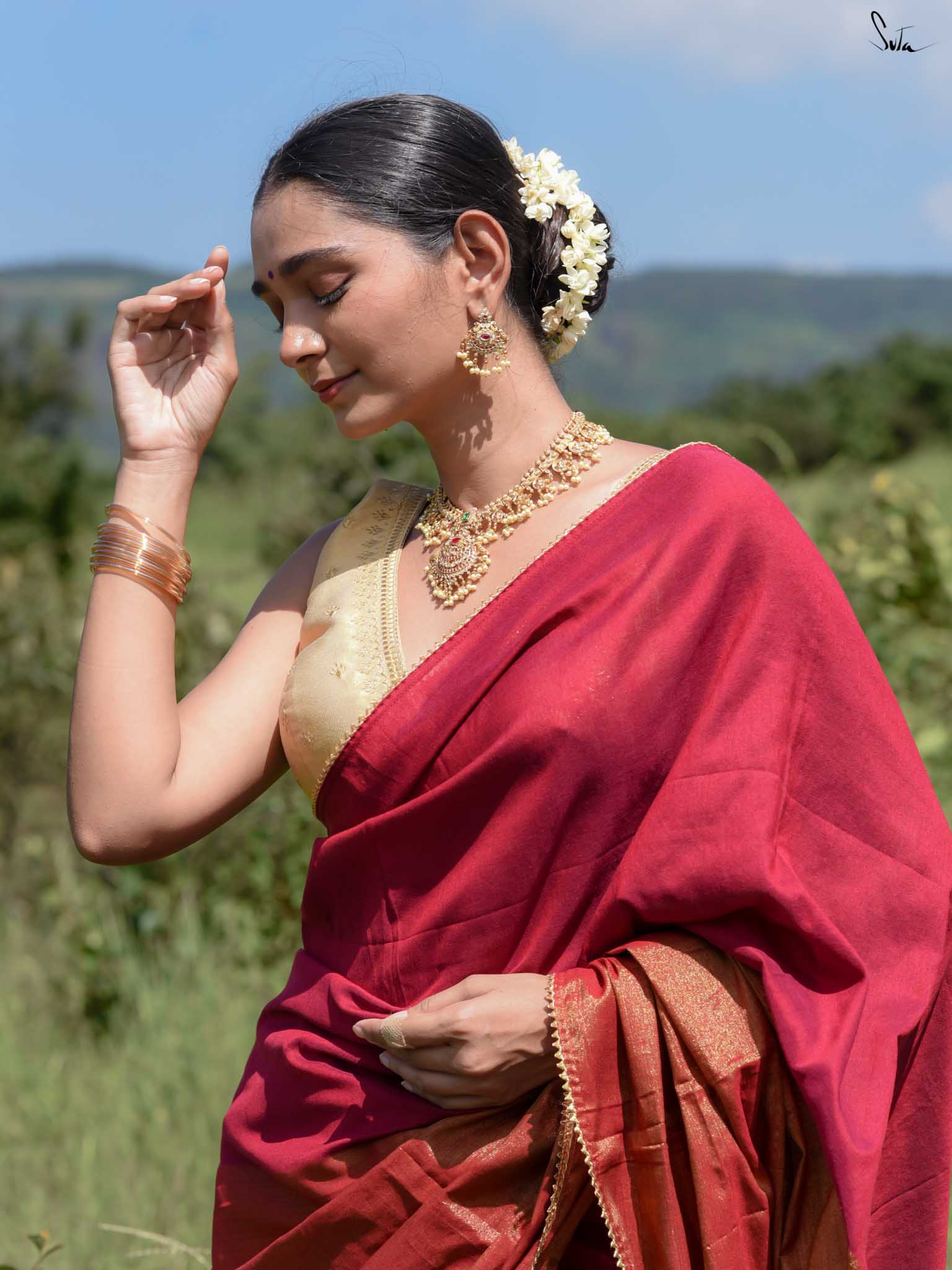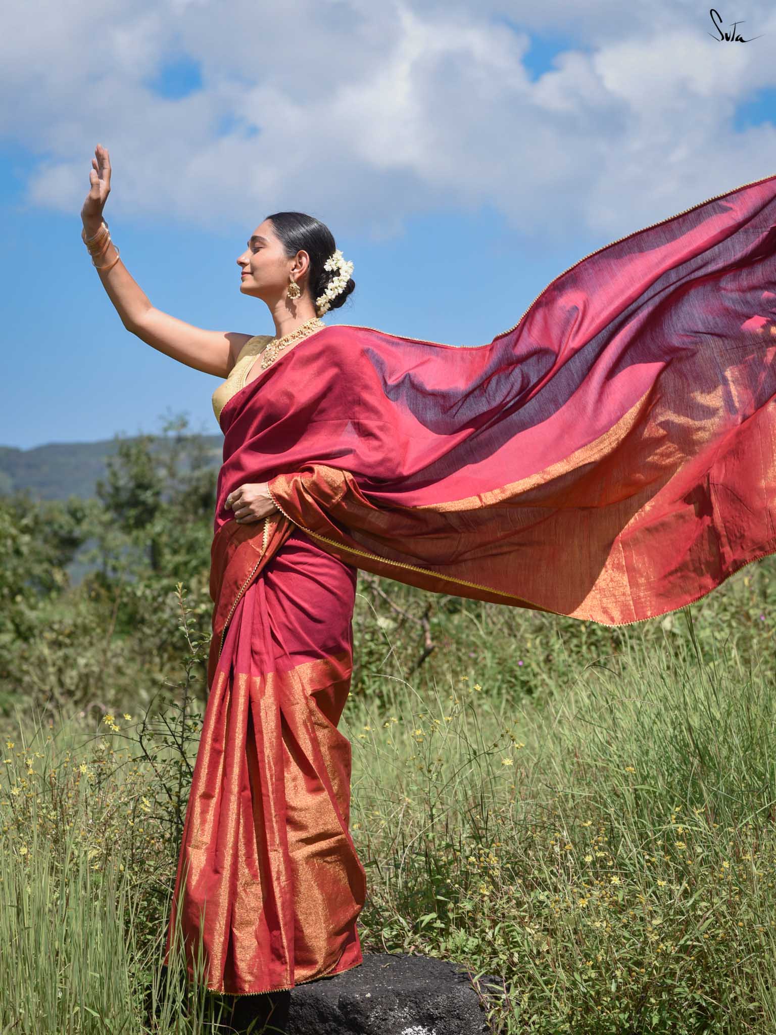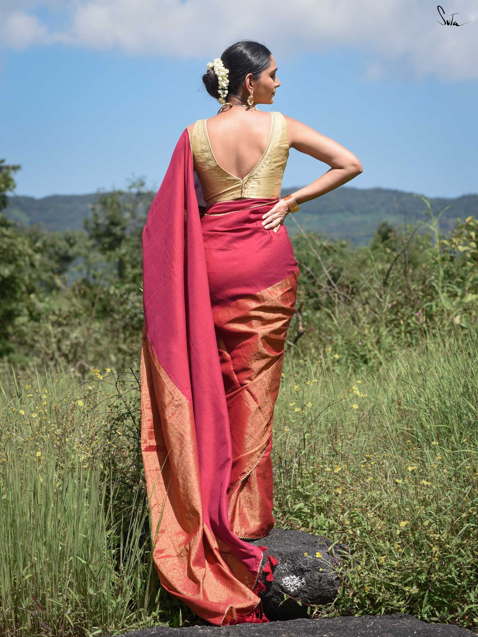 Rich, regal, and effortlessly graceful Dipped in Wine is where tradition meets timeless allure. This cotton-acrylic saree features a stunning half-and-half design of deep maroon and gleaming gold zari, finished with elegant Gota patti and Samosa lace along the borders. Every weave reflects festive grandeur, making it the perfect choice for weddings, celebrations, and special evenings that call for a touch of gold and glory.