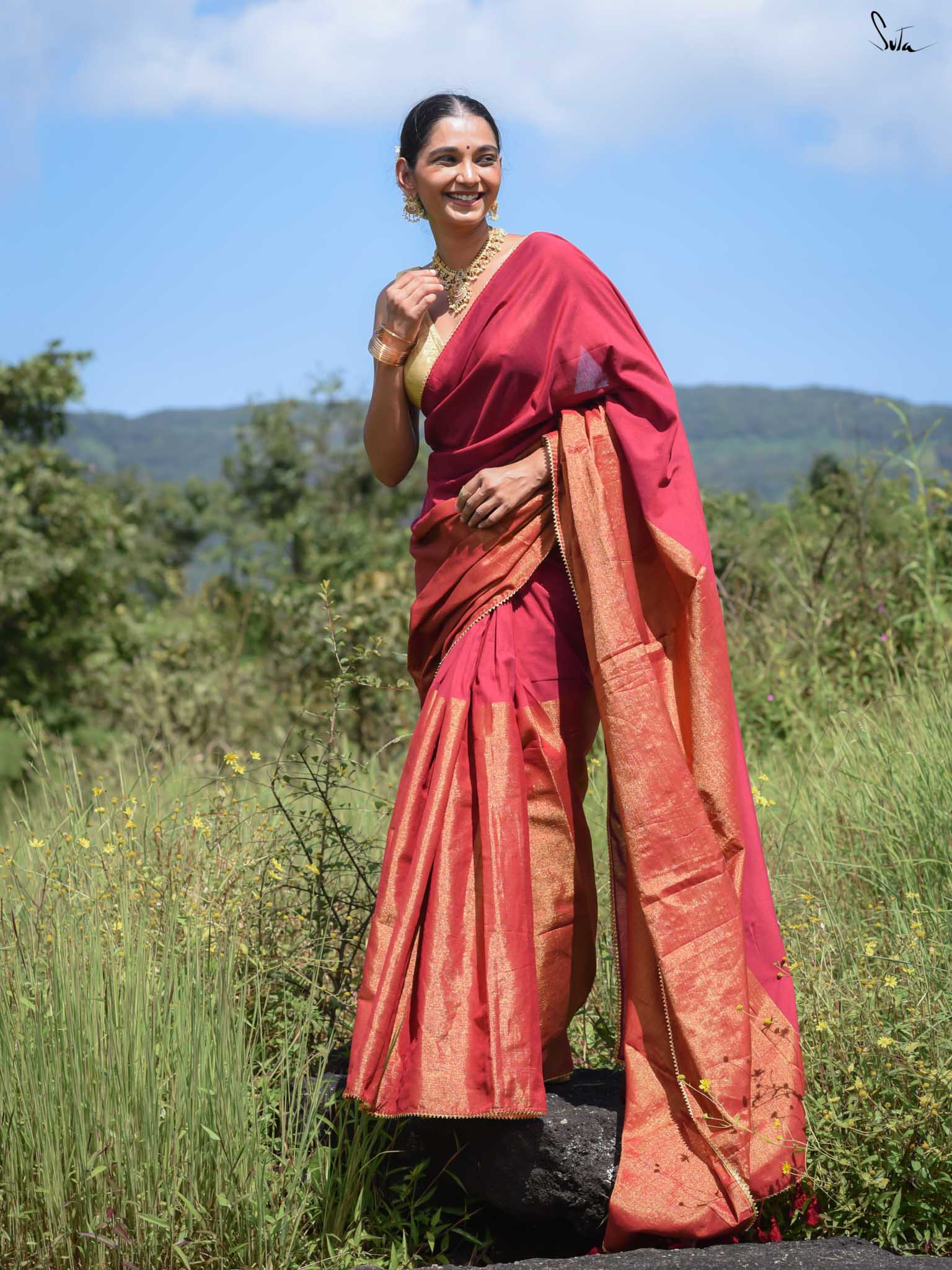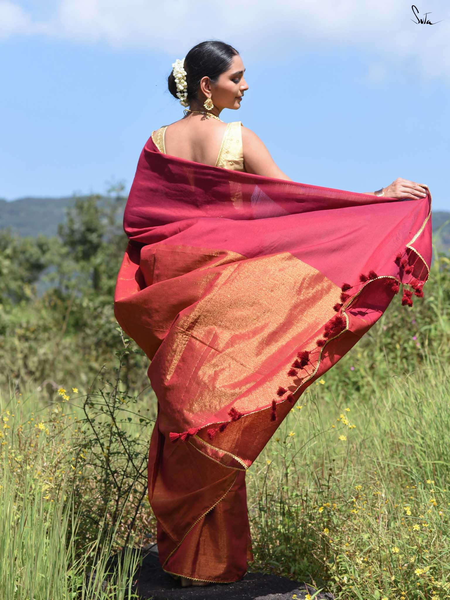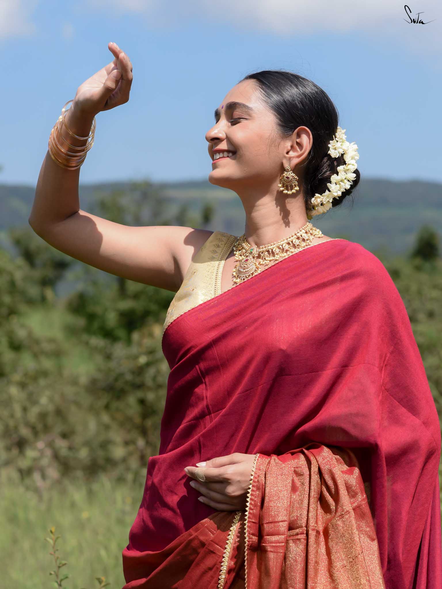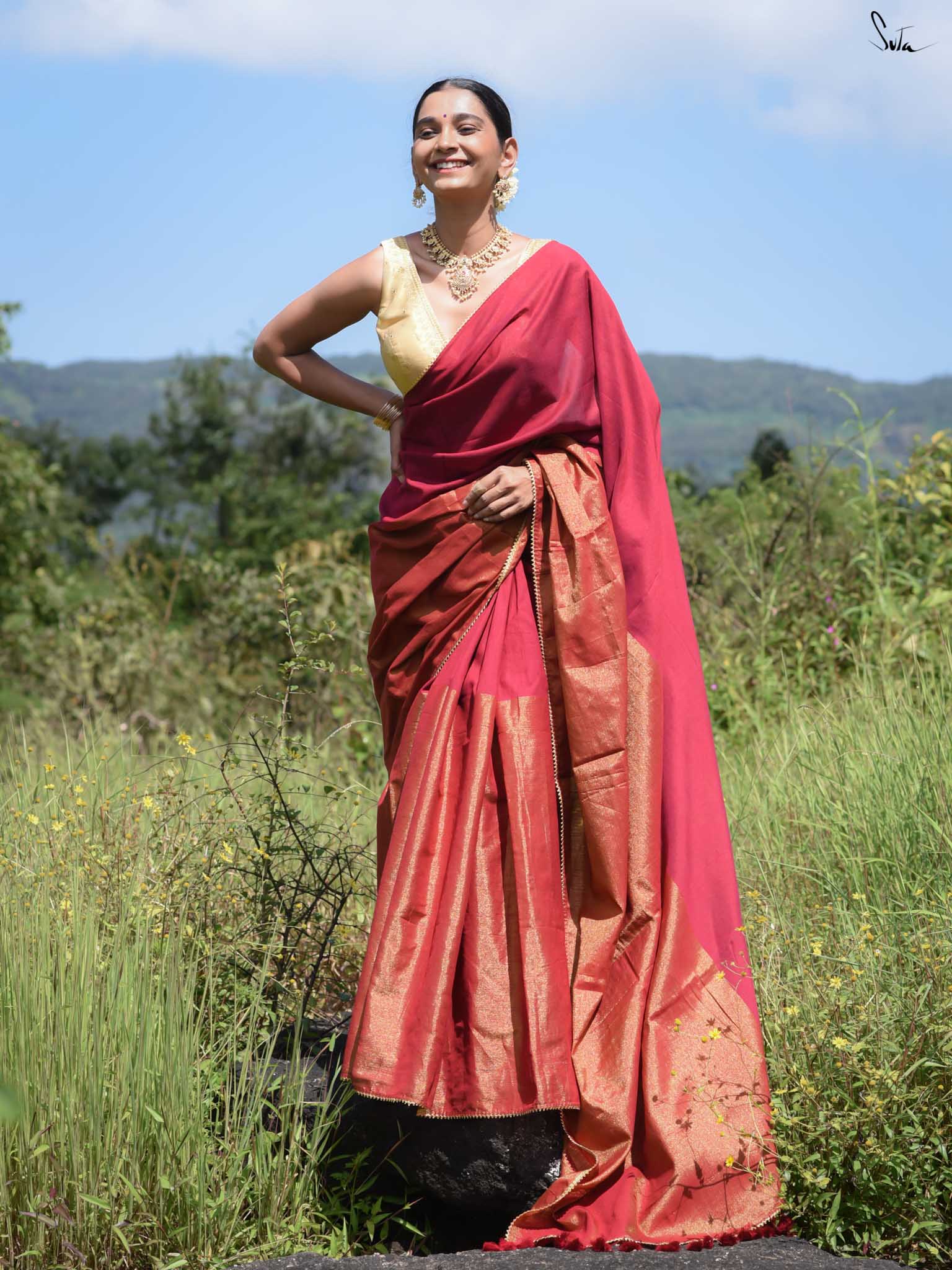 Rich, regal, and effortlessly graceful Dipped in Wine is where tradition meets timeless allure. This cotton-acrylic saree features a stunning half-and-half design of deep maroon and gleaming gold zari, finished with elegant Gota patti and Samosa lace along the borders. Every weave reflects festive grandeur, making it the perfect choice for weddings, celebrations, and special evenings that call for a touch of gold and glory.