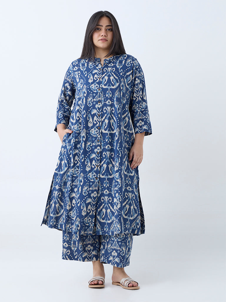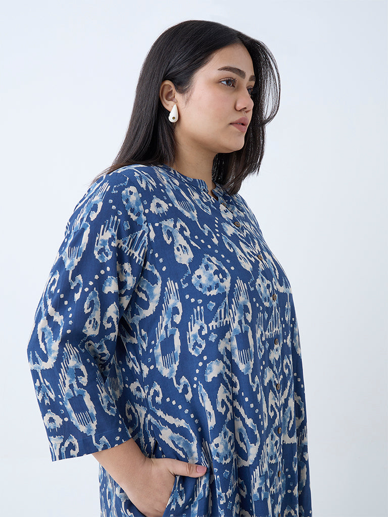 Elevate your daily wardrobe with this dark blue kurta from Diza, defined by traditional ikat-inspired detailing. Cut in a flattering A-line silhouette from high-quality fabric, it features a band collar, button placket, and three-quarter sleeves for balanced ease. Finished with a functional slip pocket, it's a versatile piece that blends tradition with everyday utility.