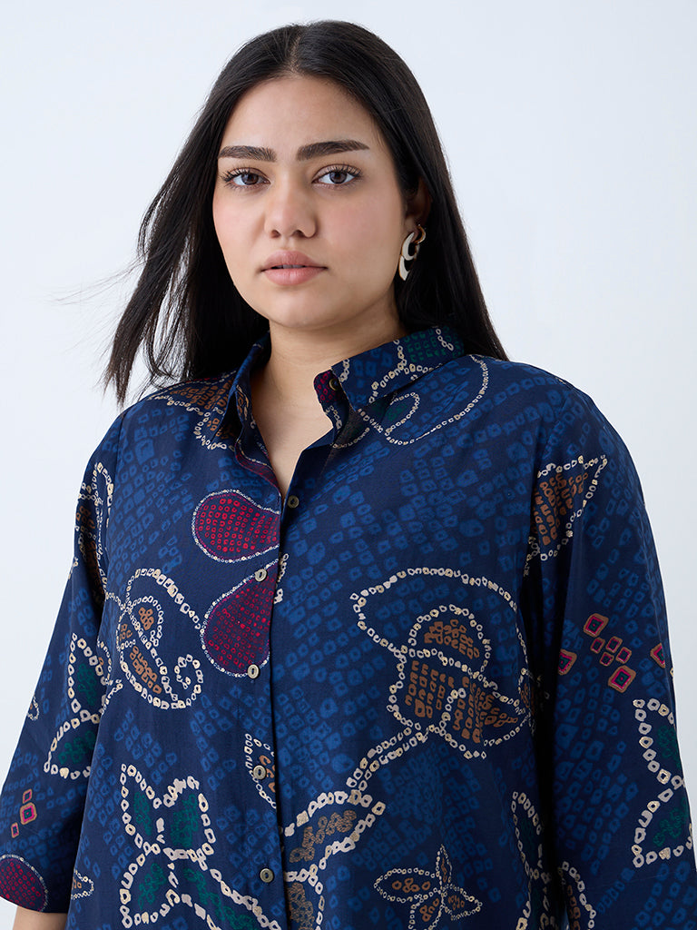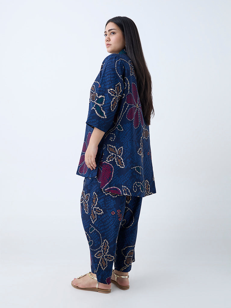 This indigo tunic from Diza is patterned with bandhani floral motifs that lend it an artisanal feel. Made from a lightweight fabric, it includes a collar, a button placket, and three-quarter sleeves that offer comfort with structure.