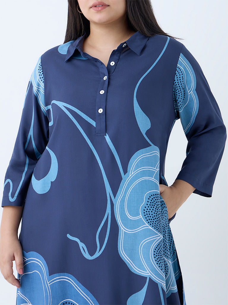 This navy kurta from Diza is highlighted with vibrant floral motifs that lend a touch of statement to its everyday appeal. Spun from quality fabric in a flattering A-line silhouette, it features a collar, a brief button placket, and three-quarter sleeves. A discreet slip pocket adds practical ease, making it a functional pick for occasion-ready dressing.