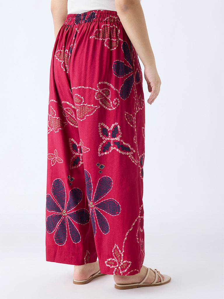 The perfect mix of modern vibe with traditional details, these red ethnic pants from Diza features bandhani-inspired floral designs for added elegance while the elasticated waist ensures a comfortable fit.