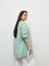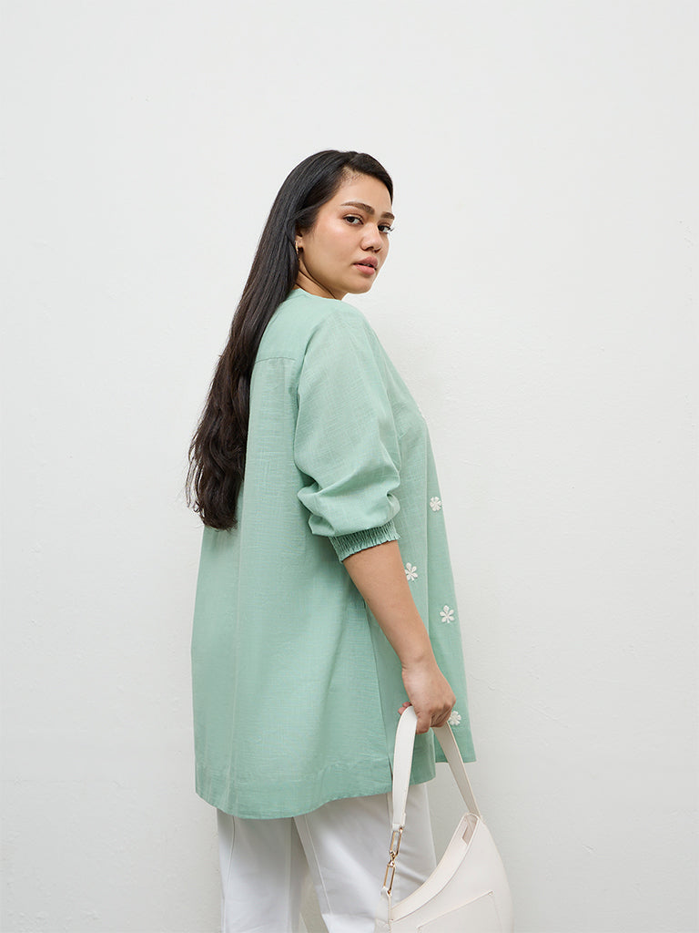 Diza presents this turquoise tunic featuring exquisite floral embroidery near the neckline and on the yoke, accentuating the design with a refined detail. The split neckline flows into a quarter-button placket with three-quarter sleeves that add an artisanal charm. Crafted from pure cotton, the fabric offers all-day comfort and a soft feel.