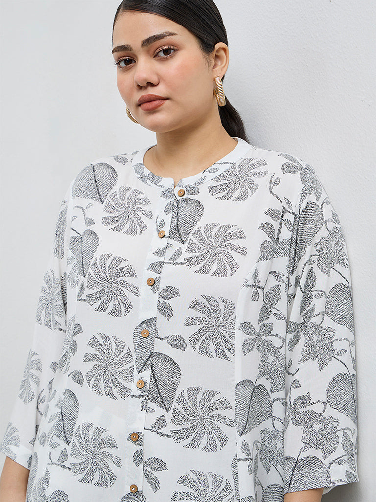 Float through the day in this white Diza kurta, detailed with delicate leaf patterns for a soft, nature-inspired look. Cut in an A-line silhouette from a breathable fabric, it features a refined band-neck collar, a buttoned placket, and three-quarter sleeves. A discreet slip pocket adds everyday ease to this thoughtfully designed ethnic staple.