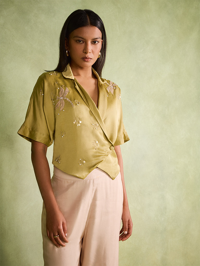Embroidered Wrap Top – Olive