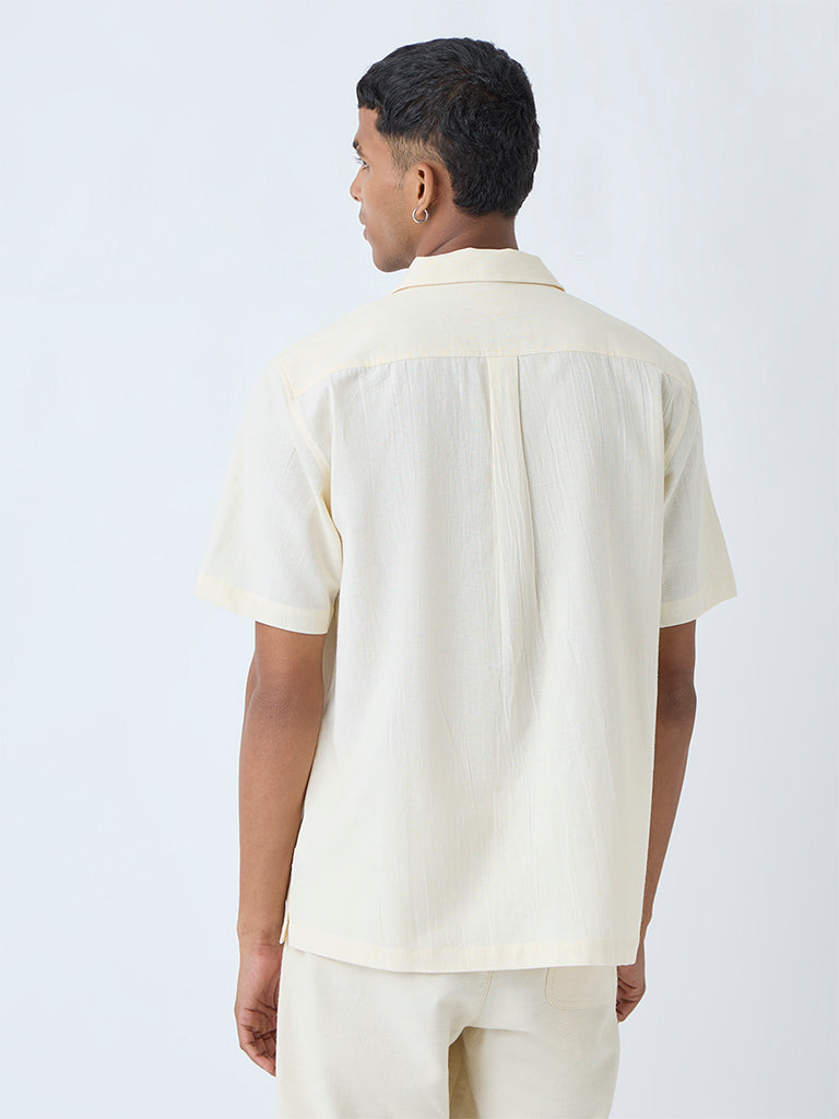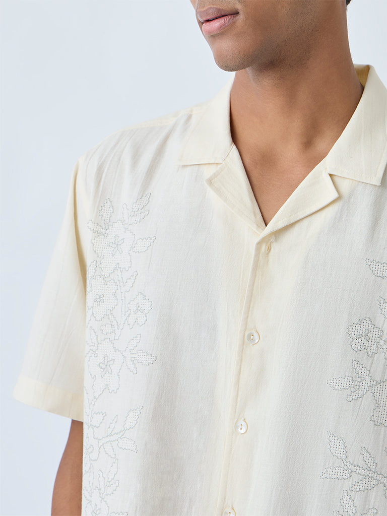 From brunch to after-dark events, this cream shirt from ETA adapts to every moment with ease. Crafted from a cotton-rich fabric, it showcases delicate floral embroidery on a relaxed silhouette. Styled with a camp collar, button placket, and short sleeves, this stylish piece blends smart-casual sophistication with effortless ease.
