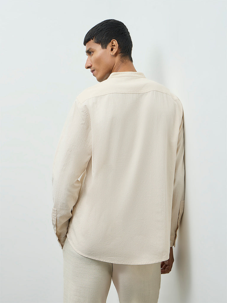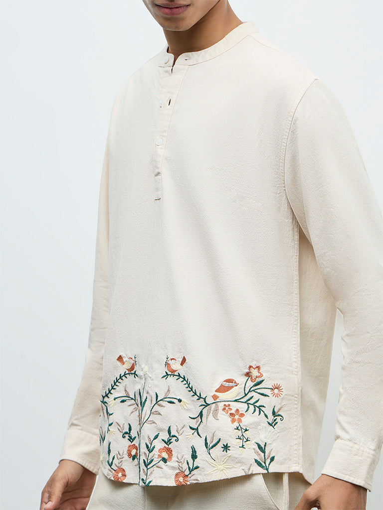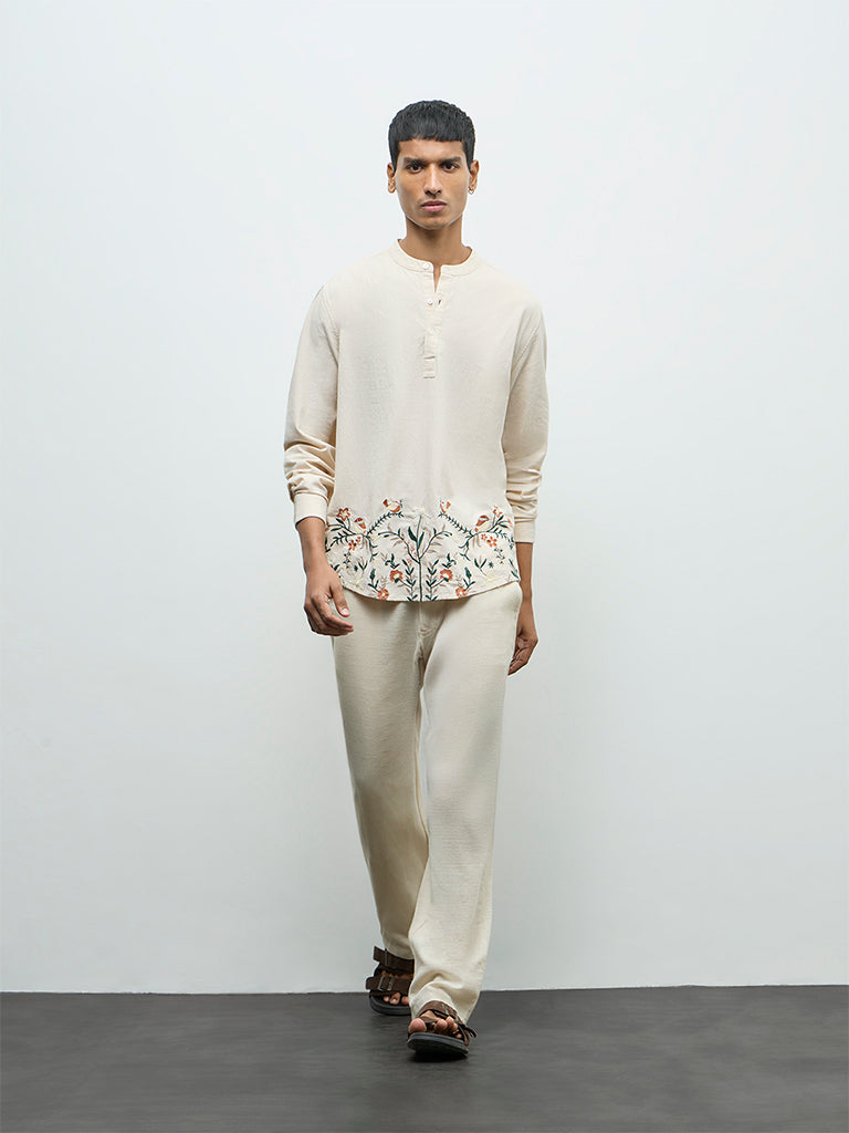 A subtle statement piece from ETA, this off-white shirt is spun from a soft, breathable fabric for everyday comfort wear. Featuring floral embroidery along the hem that adds a distinctive finish, this relaxed frame is styled with a band neckline, full sleeves and a short button placket. Easy pick for elevated casual dressing.