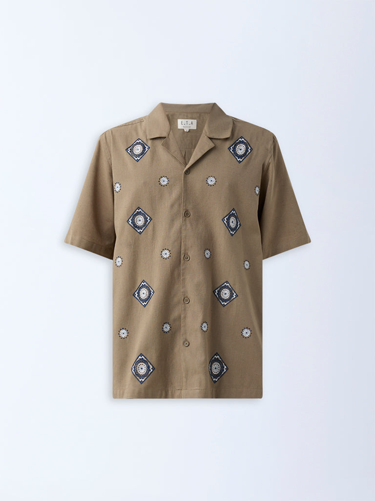 This olive shirt from ETA is fashioned with intricate embroidery for a contemporary look. Milled from a cotton-blend fabric with a relaxed handle, it is styled with a notched collar, half sleeves, and a button placket.
