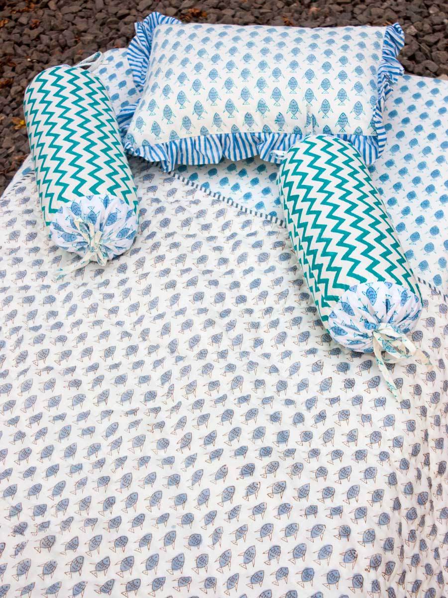 Presenting playful crib/cot hand block print GOTS certified organic cotton fitted sheets. The sheet contains elastic on the sides for easy operation and a snug fit. Made to fit all standard sizes of cots and cribs.