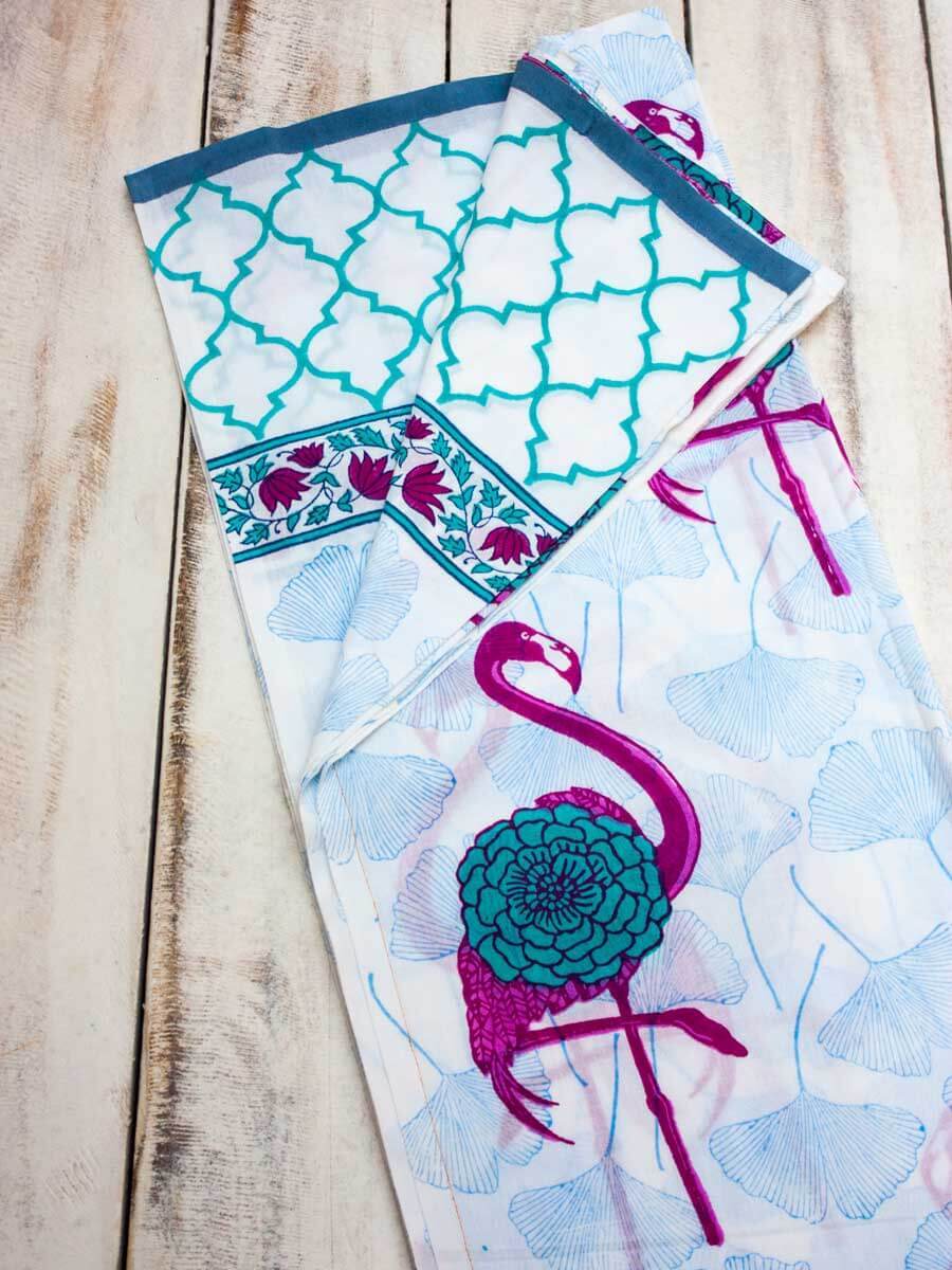 The Summer Holiday is made of all things dreamy. Flamingos, hot air balloons, polka dots, palm trees, and chevrons - this collection is equal parts tropical, vacation vibes, and nostalgia. The coming together of contemporary elements with traditional Indian hand block printing makes this collection special. Each motif is given a traditional design touch so it cuts across age groups and genders, especially the hot air balloon, the center of which is inspired by Iznik (Turkey) and the floral vines at the top take inspiration from our previous collections. The collection uses our signature colors turquoise, pink, and Indigo in abundance along with accents of mustard and peach.