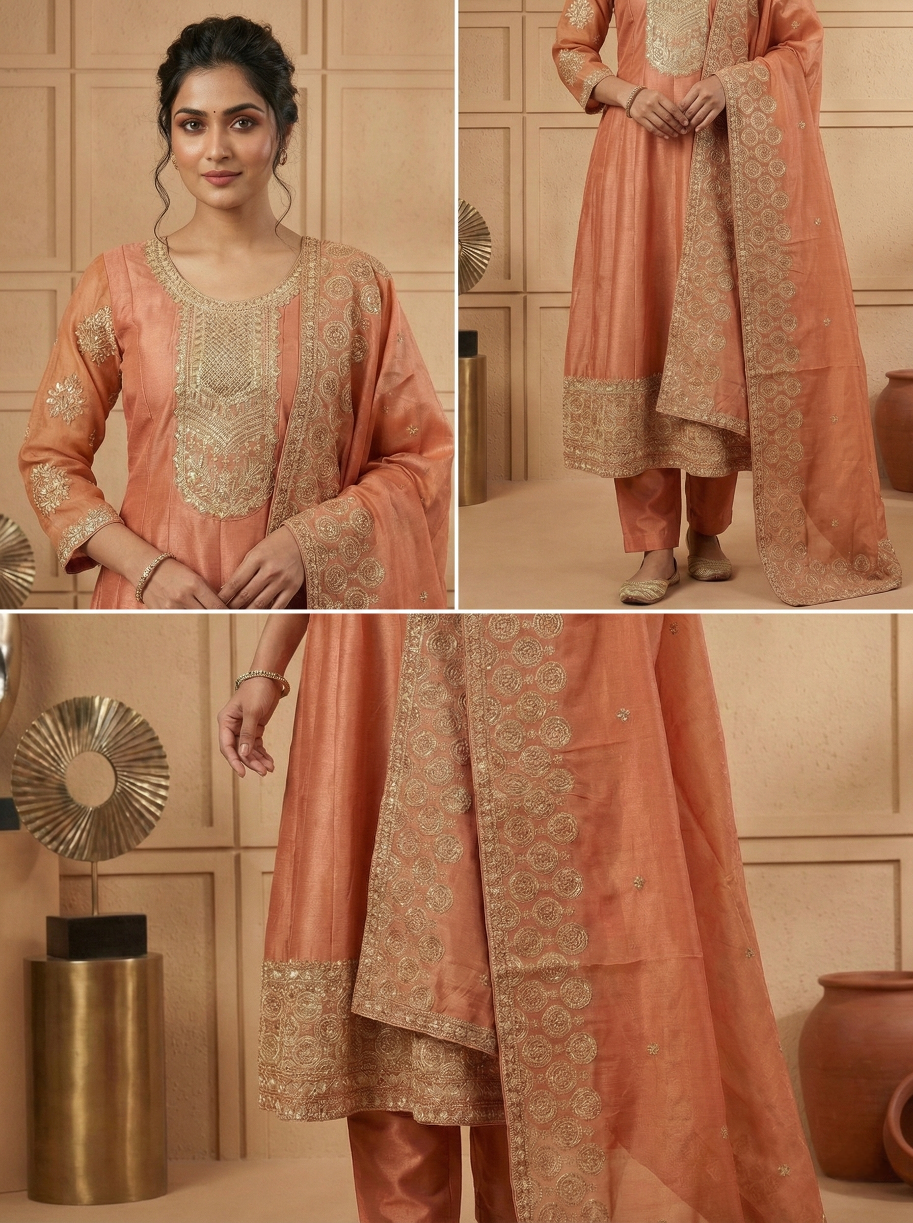 Elevate your ethnic wardrobe with this stunning Gajari Tissue Embroidery Three Piece Set. Crafted from delicate tissue fabric, this ensemble features intricate embroidery work that showcases traditional artistry and contemporary elegance. The three-piece collection includes coordinated pieces designed to work beautifully together, making it perfect for weddings, festivals, and special occasions. The rich gajari hue complements all skin tones, while the lightweight tissue fabric ensures comfort throughout the day. Ideal for those who appreciate fine craftsmanship and timeless style, this set brings sophistication to your celebration wardrobe.