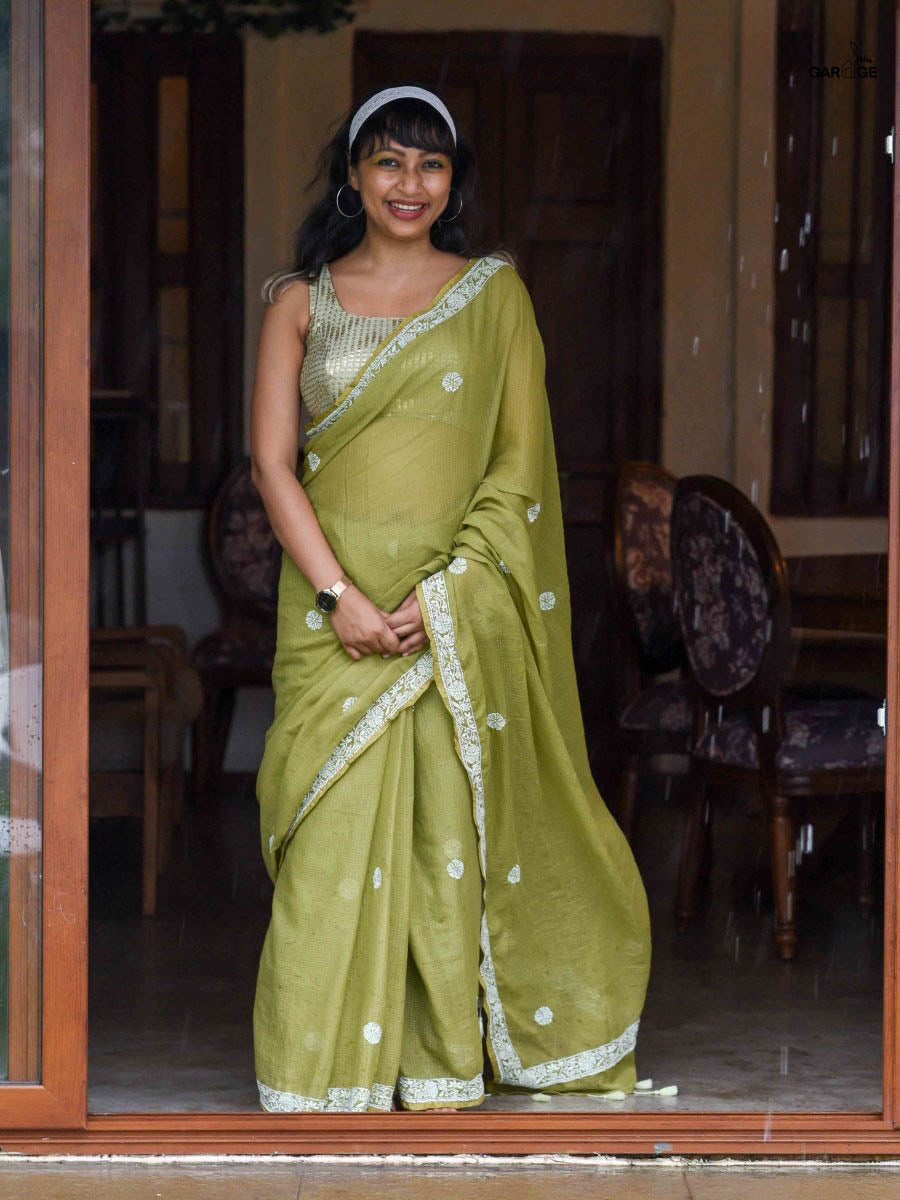 Kota cotton fabric is renowned for its softness, light weight and ease of wear. It is made using an open weave with fine checks, which are called ˜khats. This weave ensures that the resultant fabric is airy and comfortable. This Kota cotton fabric forms the base of these sarees, which are further embellished with Lucknowi chikankari work. Chikankari is a style of embroidery that has its roots in Lucknow, the capital of Uttar Pradesh. The word 'chikan' is derived from the Persian word 'chikeen'. In its most traditional form, chikankari work reflects the influence of the intricate carving patterns found in Mughal architecture. The legacy of chikan work in Lucknow dates back to more than 200 years.